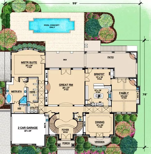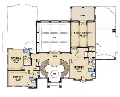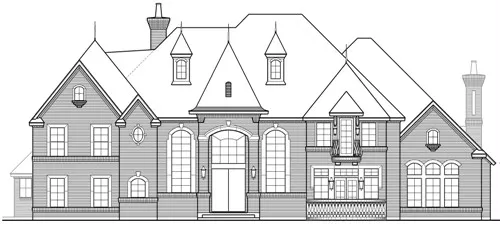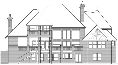 This elegant luxury chateau home plan showcases exterior architectural elements and varied ceiling treatments. Entering through the double front doors to the two-story foyer, your eyes are immediately drawn to the stunning spiral staircases. You can see through the great room with warming fireplace flanked by built-ins to the rear of the house. To the right of the foyer is the elegant dining room with built-ins and doors onto the veranda. Adjacent to the dining room is the pantry and kitchen for ease in serving family and friends. In the family gathering area, the gourmet kitchen offers a free-standing island and breakfast bar for serving the family room and breakfast area. A built-in desk in the breakfast area sits under a window for extra lighting. The family room has a coffered ceiling, built-ins, warming corner fireplace and doors that lead to the patio and deck. The master suite boasts a trey ceiling, entrance to the deck and a lavish master bath with his and hers vanities, separate shower, tub and large his and hers wardrobe. Upstairs three family bedrooms with trey ceilings, walk-in closets, and full baths share space with the vaulted study/library with private balcony, The basement offers plenty of entertaining in the game room with a bar and fireplace. There is also an exercise room, plenty of storage and a fifth bedroom with walk-in closet and full bath as well as patio access. This elegant luxury chateau home plan has four garage spaces.