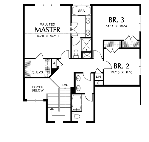 On the upper level are three more bedrooms. A vaulted salon and pampering bath combine for a luscious master suite. A walk-in closet with built-in shelves and a spa tub are other notable attractions. Family bedrooms share a full bath with double sinks and compartmented toilet and tub.