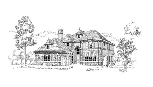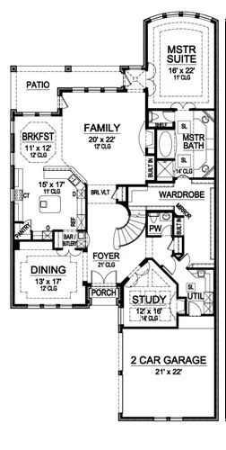 This Texas-inspired luxury house plan is perfect for a narrow lot or a zero lot line. With four bedrooms, this home would be large enough for most families. The two-story foyer with curved staircase and barrel vault ceiling is awesome. A coffered ceiling can be seen in the study through the double doors off the foyer. A private hall leads to the utility room and master suite wardrobe with built-ins and a tall mirror. The foyer also opens into the elegant dining room with tray ceiling and doors to the bar/butlery, making serving a breeze. The island kitchen offers built-ins, a pantry and a breakfast bar. The family room incorporates a bank of windows for sun to stream through, plus built-ins and a warming fireplace. The master suite boasts a curved wall of windows and a tray ceiling, plus a lavish bath with his and hers sinks, separate shower, tub and the large wardrobe. Upstairs, three bedrooms with tray ceilings, walk-in closets and direct bath access share space with a game room with a private balcony.