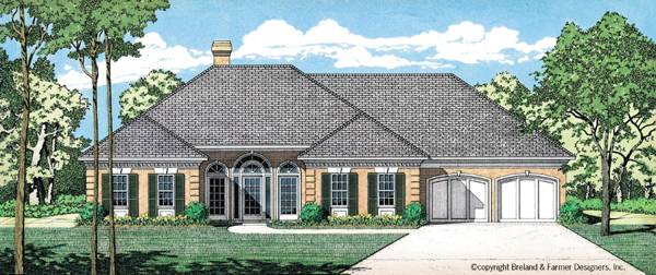 This plan is a super energy saver featuring 2 x 6 exterior walls. Beautiful arched windows lend a luxurious feeling to the exterior of this one-story home. Soaring 12-ft. ceilings add volume to both the entry area and the living room, which boasts a fireplace and access to a covered porch. Highlights of the kitchen include a pantry and an angled eating bar.