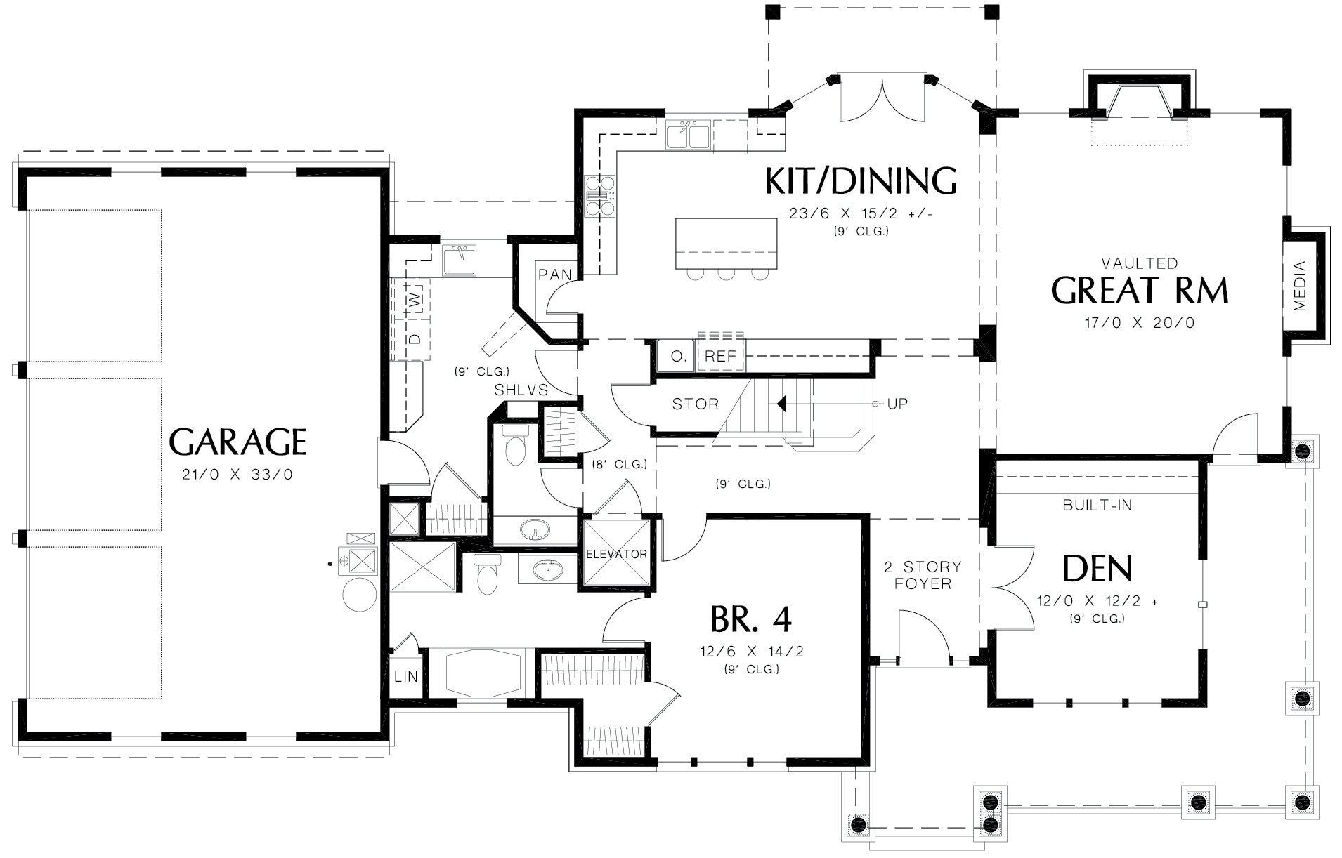 Near the front of the plan is a bedroom with walk-in closet and full bath. Use it as a master suite or reserve it for guests. All main-level rooms have nine-foot ceilings except the great room, which is vaulted.