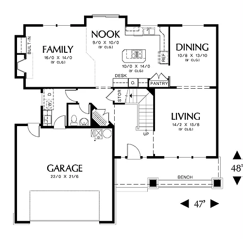 With a classic center-hall floor plan, and an exterior brightened by Craftsman details, this home appeals to the traditionalist in us all. From a covered porch entry, the plan opens to a foyer with living room on the right. To the left are a coat closet, half-bath, laundry room and access to the family room and nook. An island kitchen, with a built-in desk and a pantry, separates the nook from the formal dining room. The family room is appointed with a fireplace and built-in cabinetry. Note that all main-level rooms have nine-foot ceilings. Bedrooms inhabit the upper level - there are three, or four if you develop the loft space accordingly. Both upstairs baths are commodious, but the master bath shines with a spa tub, walk-in shower and dual sinks. Built-in shelves in the walk-in closet make the most of storage. A two-car garage finishes the plan off handily.