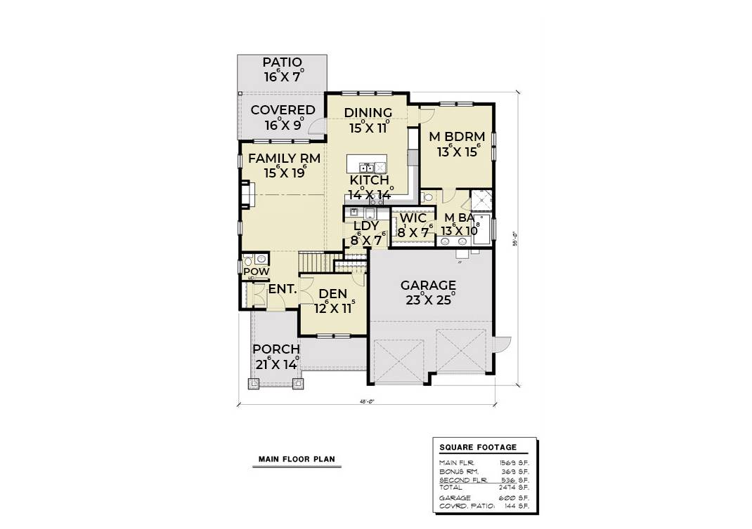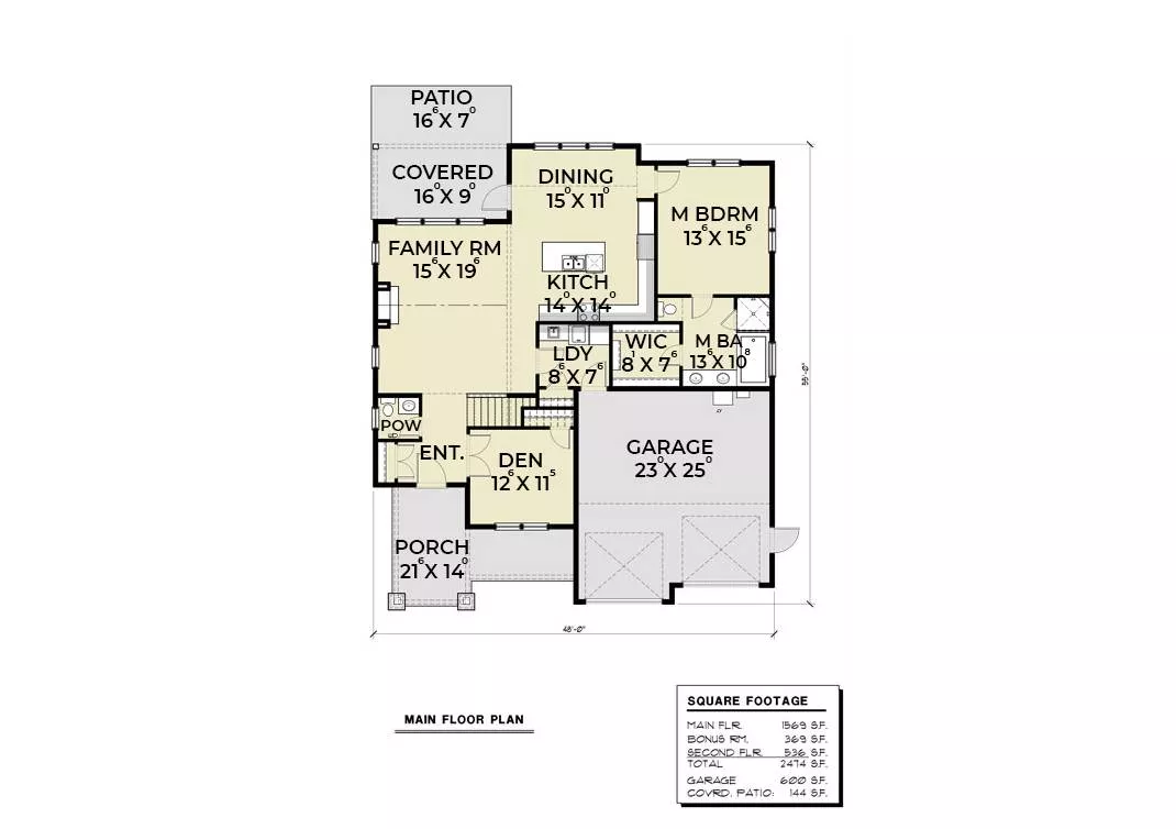 The appealing details of a craftsman make this farm house style plan full of charm and personality. Within its 2 stories, this 2,474 square foot home offers 3 bedrooms and 2.5 bathrooms. A 2 car garage and beautiful covered archway adorn the front of this plan. The first floor is home to a den, as well as a large family room with attached kitchen and dining room. The dining room provides access to the covered porch and patio area, as well as the first-floor master suite. Within the master suite is a large walk-in closet as well as a relaxing spa tub and separate tiled shower. Moving on to the second floor, you will find 2 more bedrooms and a shared bathroom, as well as a bonus room, perfect for all sorts of activities and uses.