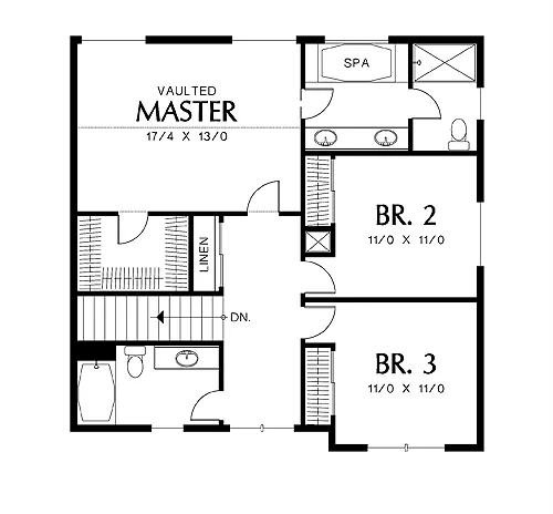 Bedrooms are on the upper levelthere are two family bedrooms and a master suite with private bath. The master salon is vaulted. Note the spa tub in the master bath.