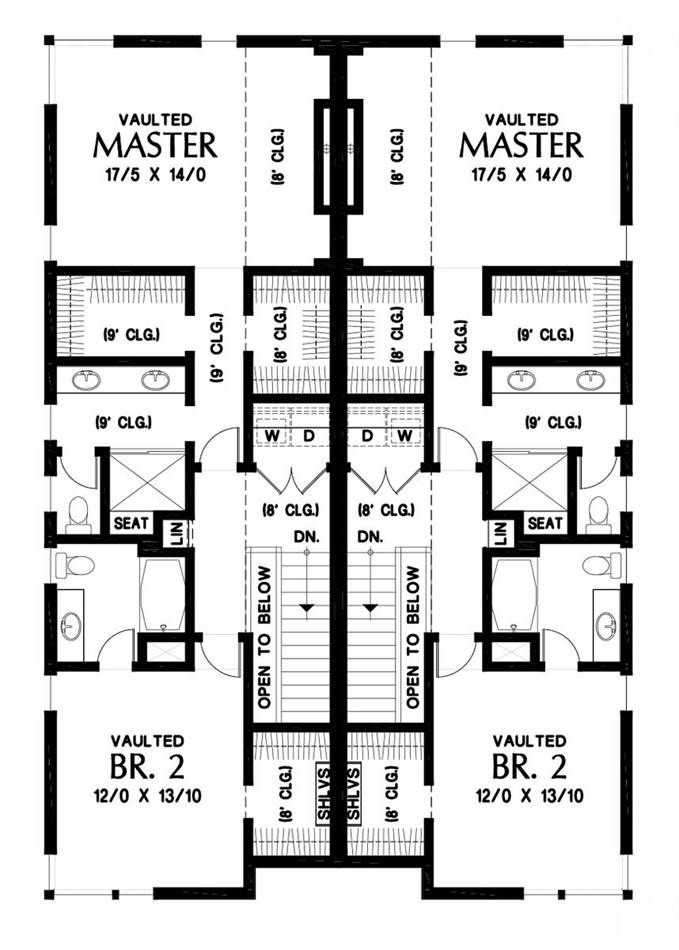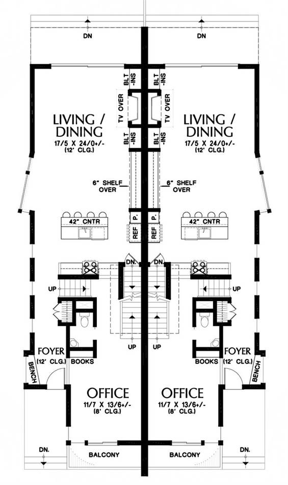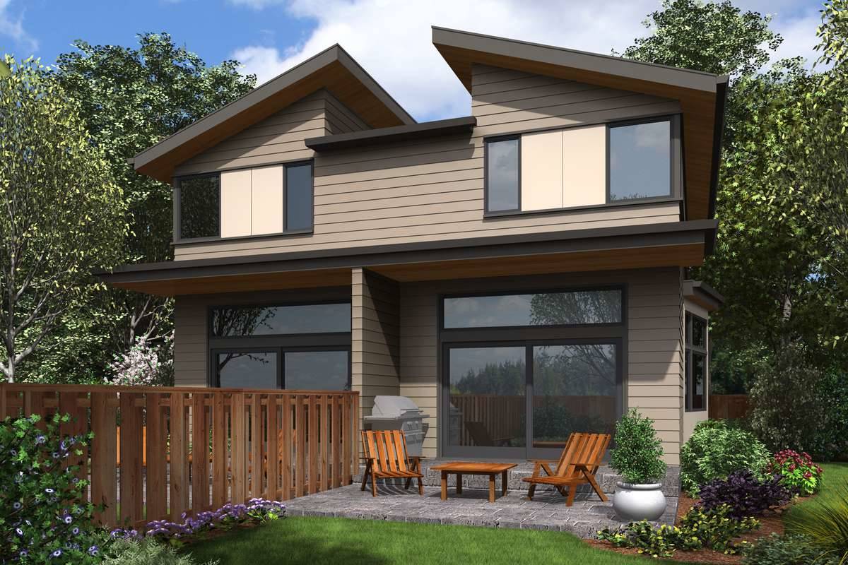 Highly efficient and full of style, this contemporary style duplex maximizes its footprint, offering 2 spacious units with 3 levels a piece. A drive-under garage for each unit means that these homes take up a reduced amount of lot space, making them great for a limited build. From there, each side offers 2,001 square feet of living space, each with 2 bedrooms and 2.5 bathrooms, both sides having identical layouts. Once you park your car, move upstairs to the main level where you will find an office and powder room, as well as a quaint eat-in kitchen and a combined living and dining room space with a private balcony. The top level of each unit features all of the sleeping quarters, including the master with its large bathroom and dual his and hers walk-in closets, along with a second bedroom with its own en-suite and walk-in closet. The size of this efficient plan makes the units great options for a new couple or first-time home buyers.