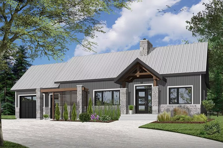 Gable details and stone accents dress up this affordable Craftsman-style house plan, with two bedrooms, one bath and 1,212 square feet of living space. Warmed by a fireplace, the central family room of this home plan is perfect for any gathering. Expand your party to the breezy rear porch. The open kitchen offers island snack space for three. The cozy dining area is great for any meal. At day's end, retire to the secluded master bedroom, where sliding glass doors open to the porch. A pocket door provides direct access to the good-sized bath, with a garden tub and a separate shower. Builders point out the versatile second bedroom in this home design, for a child or a guest.