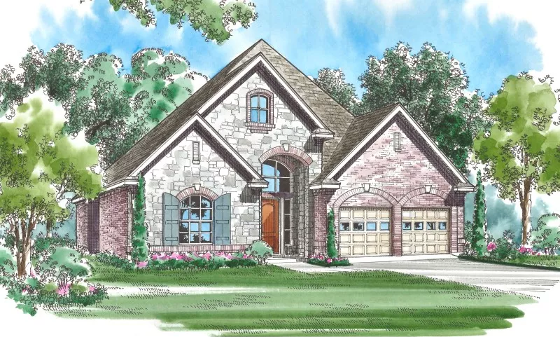 This is a a beautiful 2,368 square foot traditional home plan, with living all on one level. It features 3 bedrooms and 2 full baths along with a 2-car front entry garage. Once you enter the home from the front porch, you'll find yourself standing in the foyer. Two bedrooms are off to your left; ahead of you lies the family, dining and state-of-the-art kitchen, all of which are part of the open floor plan design. The bank of windows and door in the family room allows the sunlight in, along with easy access to the patio. The luxurious master suite has a trey ceiling, master bath with dual vanity, a separate shower, tub and large wardrobe.
