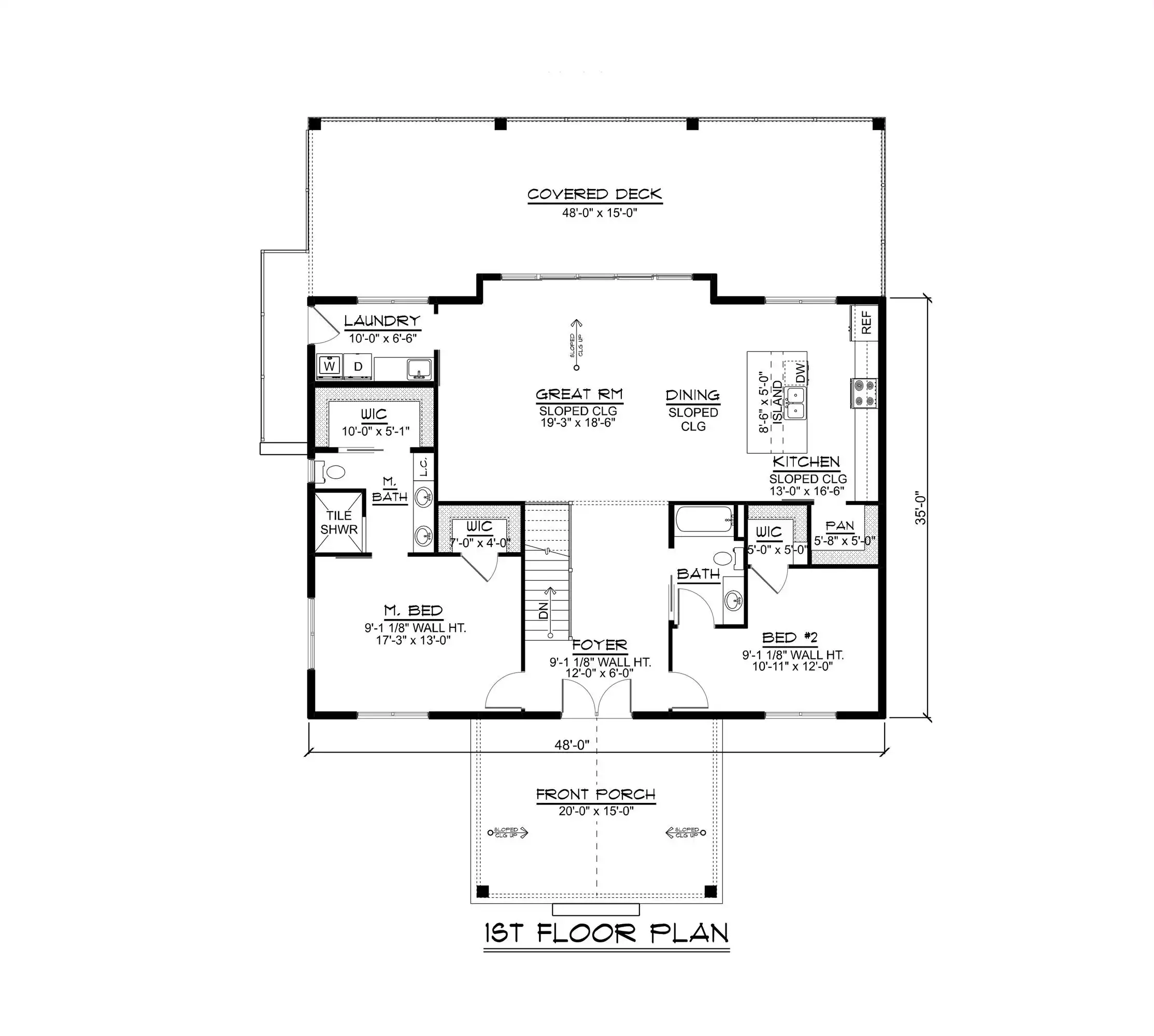 Stapleton View offers the same modern barndominium charm and flexible layout as its garage-included counterpart, House Plan 10898, just without the attached garage. With 1,679 square feet on the main level and an optional 1,720-square-foot lower level, this home balances style and functionality. A spacious front porch welcomes you into the airy foyer and open living area, where sloped ceilings crown a beautiful great room, dining area, and a kitchen complete with island and walk-in pantry. Large rear windows and access to the expansive covered deck make it ideal for indoor-outdoor living. The split-bedroom design places the primary suite, with ensuite bath and walk-in closet, on one side of the home, and a secondary bedroom with its own ensuite on the other. The optional finished lower level adds a third bedroom, kitchenette, generous storage, and multi-use flex space, offering endless possibilities for guests or lifestyle needs.