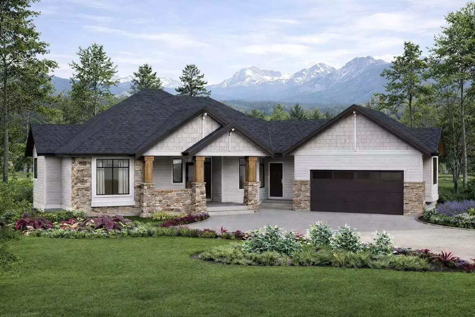 Hazelwood is a striking 1,773 square foot home designed for a sloped lot, blending charm, comfort, and functionality in a unique layout. This two-bedroom, two-bathroom design features an angled garage and an extra-large mud/laundry room, creating a distinct V-shaped footprint and a dramatic stairway leading to the included unfinished basement. The inviting covered front porch sets the tone for relaxed living, offering ample space for potted plants and outdoor seating. Inside, the foyer opens to an airy great room with a cozy fireplace, flowing seamlessly into the dining area and a well-appointed kitchen with a prep island, G-shaped counters, and a walk-through pantry. Sliding doors lead to a covered deck and adjoining sundeck—ideal for enjoying every season. The private master suite overlooks the backyard and includes a luxurious ensuite with a soaker tub, separate shower, and walk-in closet. A second bedroom with a charming deep windowsill is situated near a full bath. Thoughtful details like barn-style garage doors, shingled gables, and stone accents give Hazelwood timeless curb appeal.
