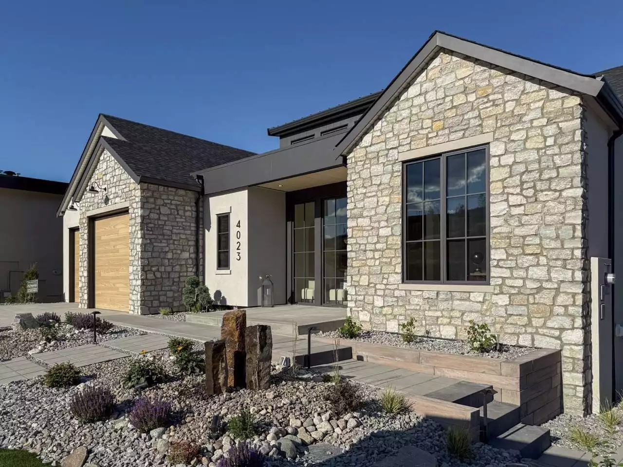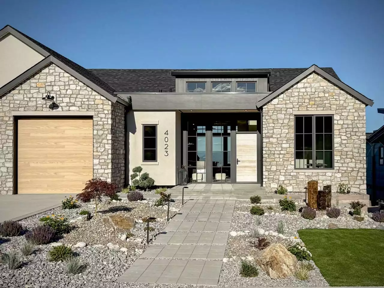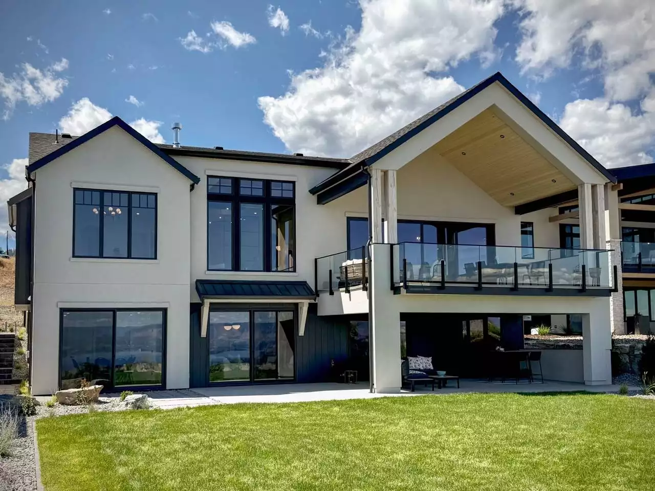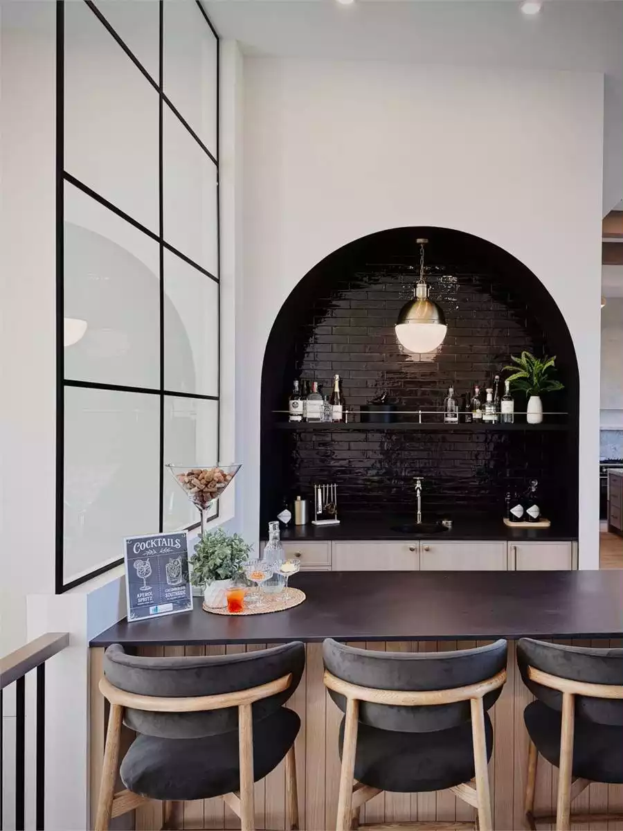The Birchgrove, a GRAND ARDA AWARD (Model Homes) winning design, is a contemporary two-story home created for a sloping lot, featuring a vaulted foyer that opens to a chic bar area, a bright great room with a fireplace, and a modern kitchen and dining area with a central island and walk-in pantry. The main floor also includes a luxurious primary suite with a spa-like ensuite and a versatile den or office. The lower level adds three bedrooms, two bathrooms, a recreation room with a bar, a gym space, and access to a covered patio, blending indoor and outdoor living with ease.
