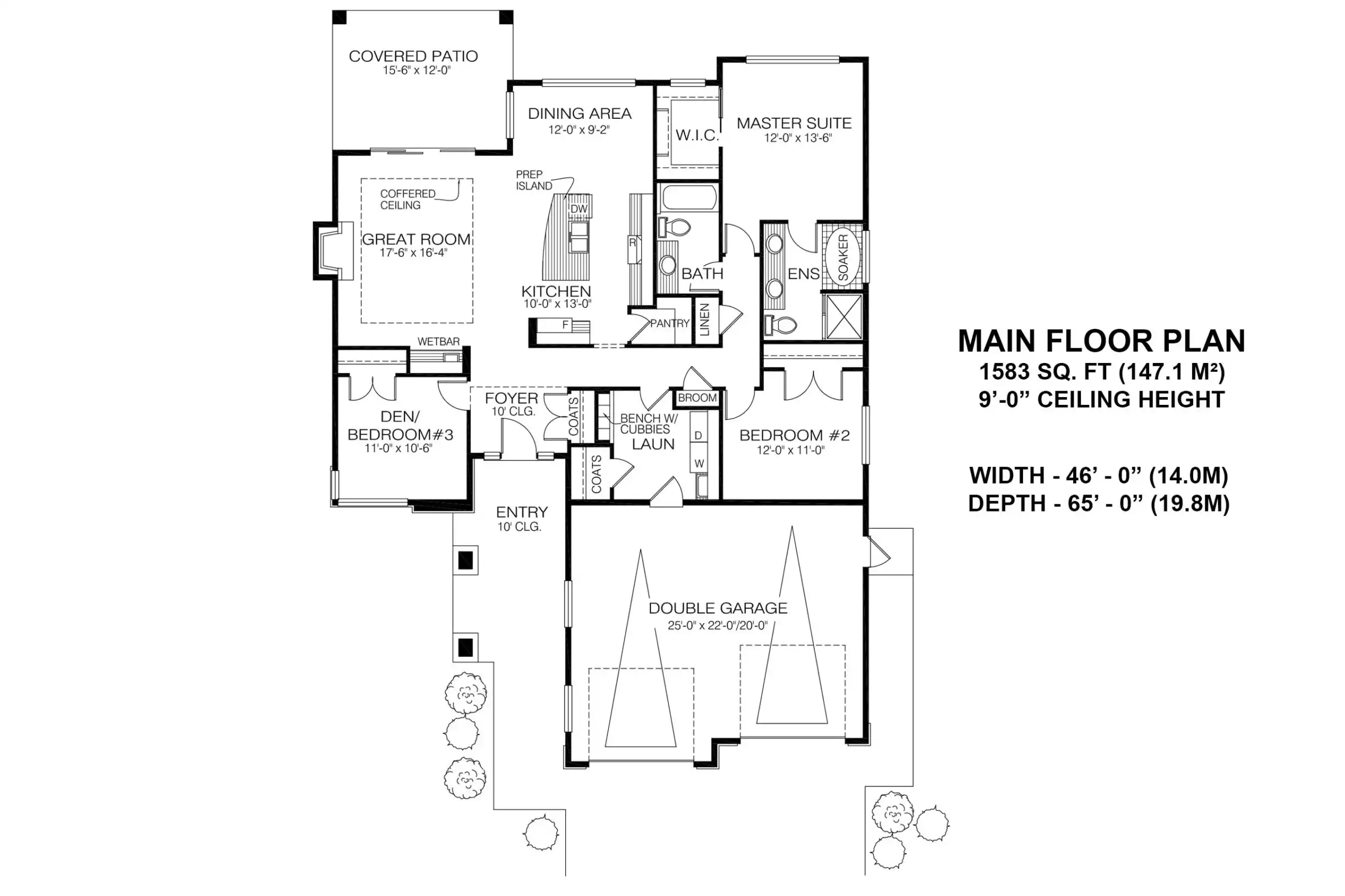 Bluebell Grove is a 1,583 square foot ranch-style home that offers elegant one-level living with thoughtful touches throughout. A 10-foot ceiling and brick-accented entry create a grand welcome into the foyer, which leads to a den that can also serve as a third bedroom. The open-concept great room features a coffered ceiling, gas fireplace, and a built-in wet bar, with sliding doors extending the living space to a covered patio. The kitchen and dining area are bright and spacious, with a curved prep island, walk-in pantry, and ample counter space. The private master suite boasts a luxurious ensuite with double sinks and a shower, and also connects to a full bath with a tub. A second bedroom sits near the laundry room, which includes a bench with cubbies and serves as a mudroom with access to the double garage. With its combination of horizontal siding, brick details, and stylish finishes, Bluebell Grove is the perfect blend of comfort and curb appeal.
