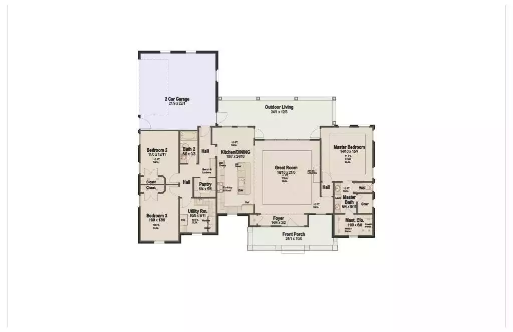 Harrisway is a thoughtfully designed 1,928-square-foot one-story home that blends open-concept living with practical details for everyday comfort. A covered front porch leads into a welcoming foyer and a stunning great room filled with natural light and views of the rear outdoor living space. The heart of the home includes an L-shaped kitchen with a central island, walk-in pantry, and a dining area perfect for hosting or family meals. On the right side, the private primary suite features a spacious ensuite and a generous walk-in closet. The left wing offers two additional bedrooms with a shared full bath and a large utility room for laundry and storage. The rear-facing two-car garage includes direct interior access, making unloading groceries and daily living a breeze. Harrisway combines modern flow with cozy charm in a perfectly balanced layout.
