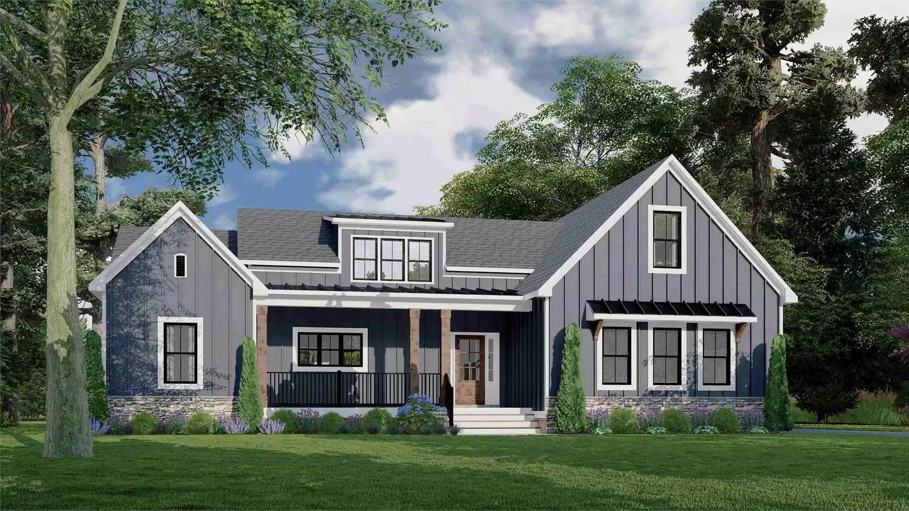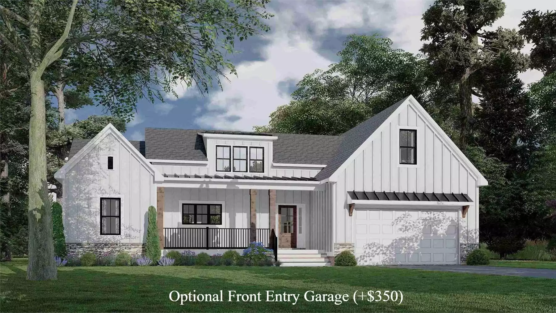 Ravenville is a charming 1.5-story traditional home with a welcoming covered front porch and a vaulted family and dining room that opens to the rear covered porch for seamless indoor-outdoor living. The U-shaped kitchen features both an island and peninsula, offering ample workspace and seating. The main-level owner’s suite boasts tray ceilings, a luxurious ensuite with dual vanities, a soaking tub, a separate shower, and a walk-in closet. A split-bedroom design places two additional bedrooms on the opposite side, sharing a full bath. Upstairs, a bonus room above the garage adds flexibility, while the front-facing two-car garage provides convenience and curb appeal.