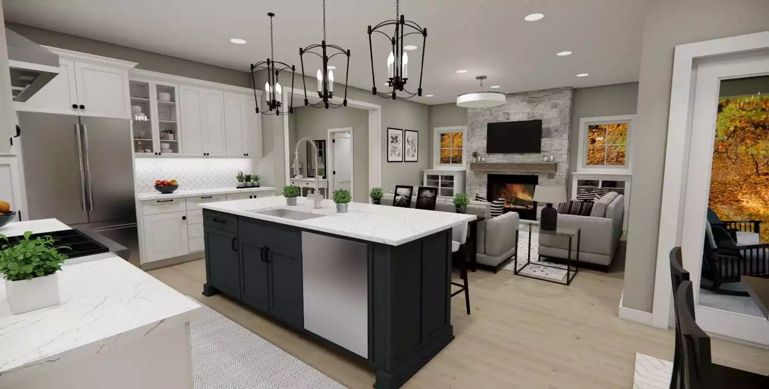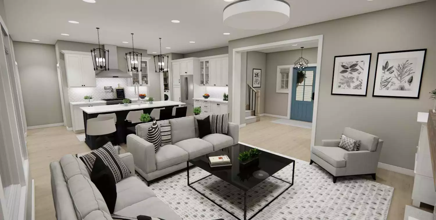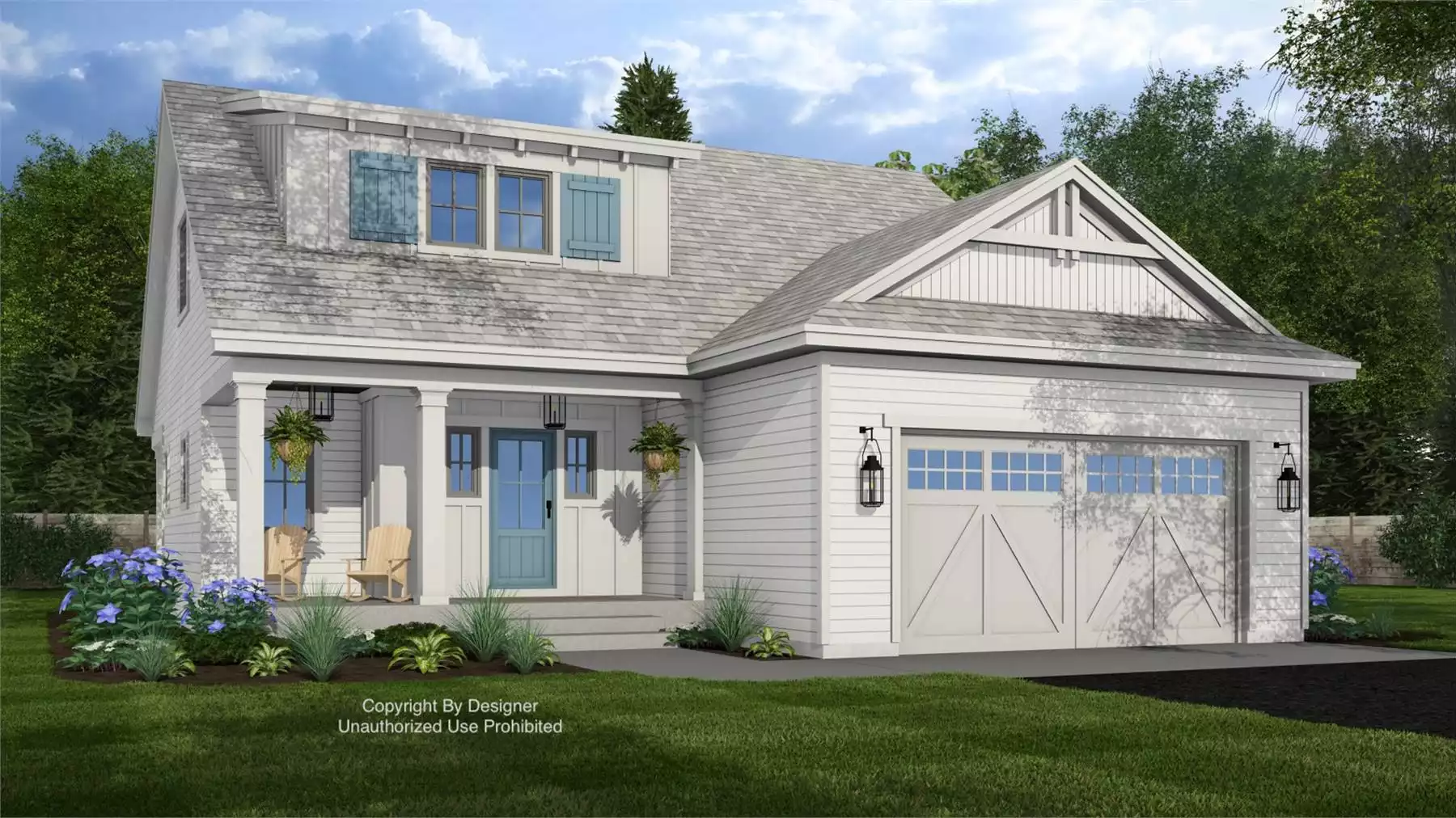 Welcome to this beautifully crafted two-story Modern Farmhouse that balances timeless style with modern functionality. Offering 3 bedrooms and 2.5 bathrooms, the main floor showcases an open-concept design beginning with a welcoming front porch and a bright foyer with 9-foot ceilings. A large 8-foot kitchen island anchors the heart of the home, connecting seamlessly to the dining area and cozy great room with a fireplace. The private main-level primary suite includes a luxurious en-suite with double vanities, soaking tub, and walk-in shower. Upstairs, two additional bedrooms share a full bath and surround a spacious loft ideal for a media room or play area. A mudroom with laundry sits just off the two-car garage, and thoughtful storage is found throughout. This inviting plan is perfect for families and remote professionals alike.