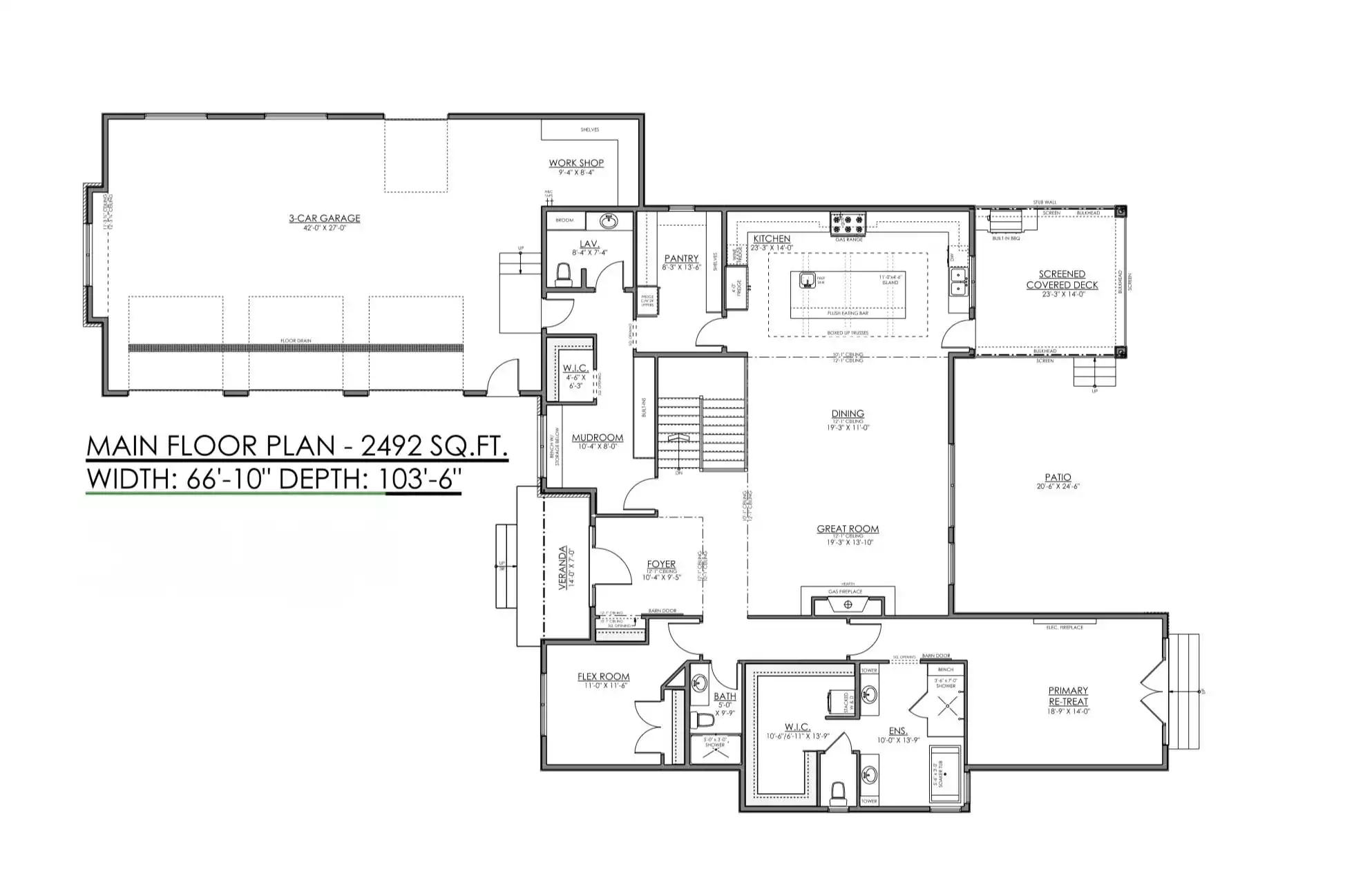 Henley Lane is a charming Country House Plan that blends rustic elegance with modern functionality. Its board and batten siding, paired with a metal roof and brick accents, creates a warm and inviting exterior. Inside, an open-concept great room, dining area, and kitchen provide a bright and airy living space, with seamless access to a screened deck for outdoor dining. A walk-in pantry, conveniently connected to the mudroom, simplifies daily routines, while the three-car garage with an attached workshop delights hobbyists. The main-level primary suite offers a 5-piece ensuite bath and a walk-in closet with a stackable laundry unit for added convenience. The walkout lower level can be finished to double the square footage, expanding the home to five bedrooms and incorporating a gym, entertainment area, and spacious laundry room, making Henley Lane a perfect balance of country charm and modern practicality.