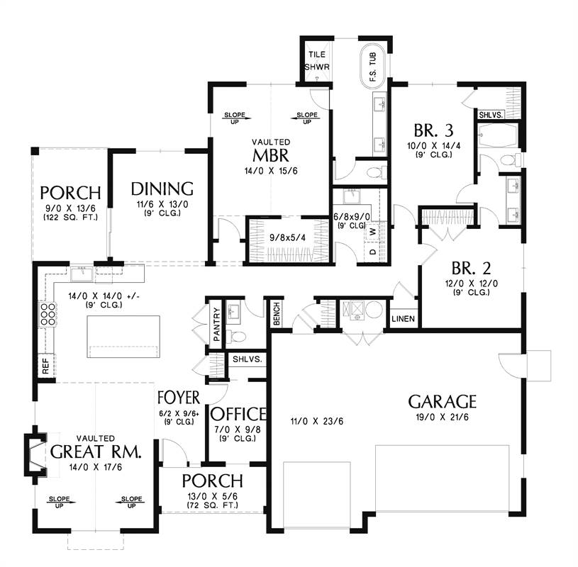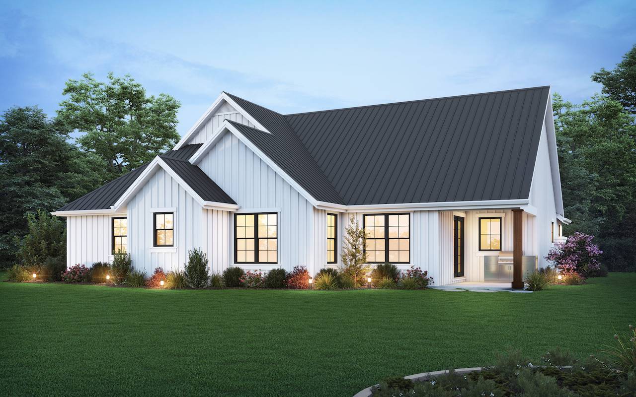 Need a one-story farmhouse that's perfect for the average family? House Plan 6654 fits the bill with 2,117 square feet, 3 bedrooms, and 2.5 bathrooms. When you step inside, you'll find a small office right beside the foyer, so this design is also ready for anybody who plans to work from home. The uniquely arranged living spaces place the vaulted great room up front, complete with a fireplace and windows on two sides. The L-shaped kitchen sits adjacent and has a large island. The dining area is tucked in back; it offers more formal definition yet maintains a casual feel thanks to the windows, porch access, and wide connection to the kitchen. All three bedrooms can be found in the hallway behind the three-car garage, so they're all private from the street! The master suite offers a vaulted bedroom and a private five-piece bath. The two secondary bedrooms share a divided Jack-and-Jill bath--they both open to the section with the dual vanity while the shower and toilet are placed behind another door. There's a powder room and centrally located laundry in this hallway as well. House Plan 6654 offers a good mix of formal and informal features, so it has a bit of something for everybody to enjoy!