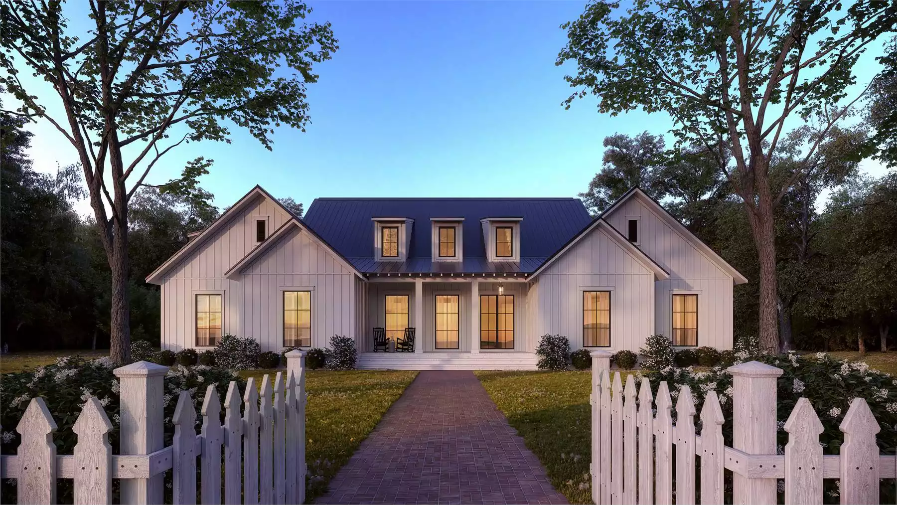 Fenwick is a stunning 3-bedroom, 2.5-bath modern farmhouse designed for serene country living. Its spacious vaulted great room offers a semi-panoramic view through expansive windows, seamlessly connecting to a charming wraparound porch for effortless indoor-outdoor living. The private primary suite is thoughtfully tucked away from the guest bedrooms, featuring a luxurious ensuite and an oversized walk-in closet. A dedicated home office provides a quiet retreat for work or study, while the optional bonus room over the garage adds flexibility for future expansion. Timeless farmhouse charm meets modern comfort in this beautifully designed home.