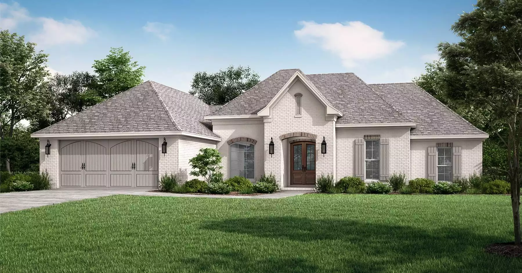 The Midland is a stunning 4-bedroom, 2-bath country French home designed to blend style and comfort seamlessly. A large foyer opens to an expansive dining room, great room, and kitchen, creating an impressive first impression. The great room features 10' ceilings, a cozy gas fireplace, and oversized rear windows that flood the space with natural light and views. Perfect for entertaining, the kitchen offers a large range, built-in pantry, ample cabinetry, and a central island with a raised bar. The oversized utility room includes a broom closet and locker area for added convenience. The luxurious primary suite boasts a spacious walk-in closet, dual vanities, a jet tub, custom glass shower, separate linen storage, and an enclosed toilet room. With thoughtful details throughout, the Midland is an inviting home that perfectly balances elegance and functionality for today's families.