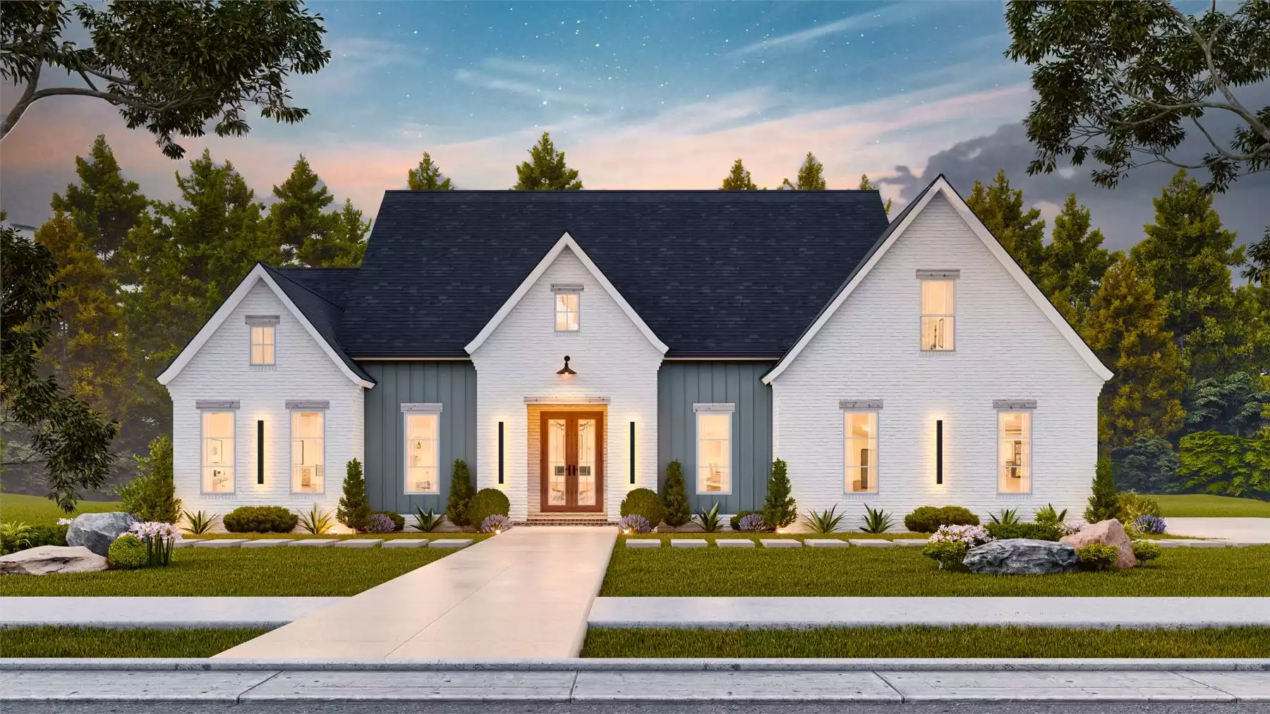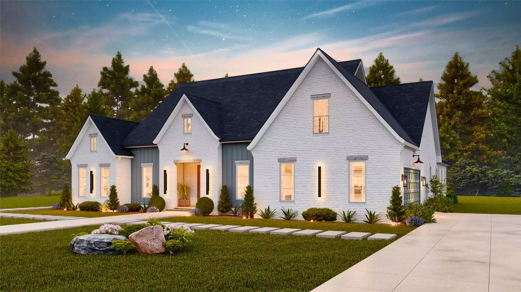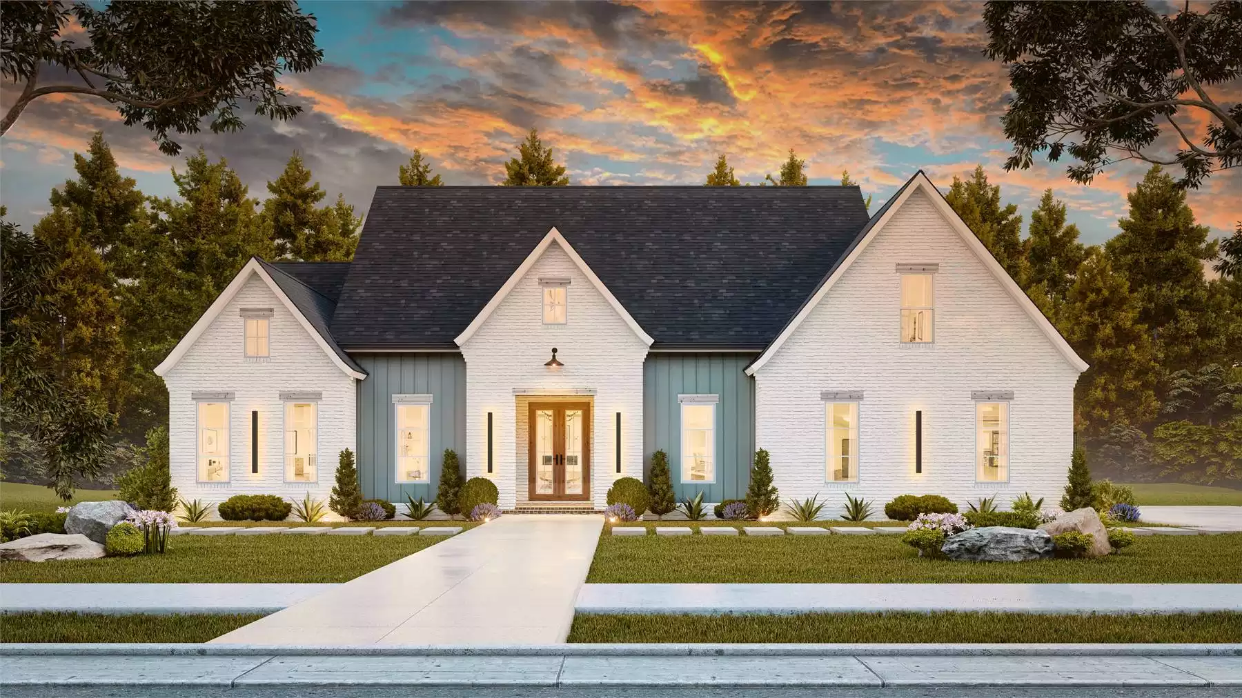 Robin Hollow is a stunning modern farmhouse designed with exceptional interior spaces and stylish functionality. The expansive primary suite features a vaulted tray ceiling, a luxurious ensuite with double vanity sinks, a soaker tub, a separate shower, and his-and-hers walk-in closets. Two additional bedrooms each have private bathrooms, with a powder room available for guests. The vaulted great room, dining area, and chef’s kitchen with a central island and casual seating create an inviting open-concept layout, while a front-facing office adds a dedicated workspace. Outdoor living is enhanced by a large rear covered porch with an outdoor kitchen, and a two-car garage with side access completes this beautifully crafted home.