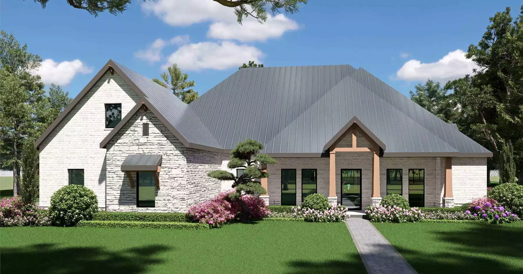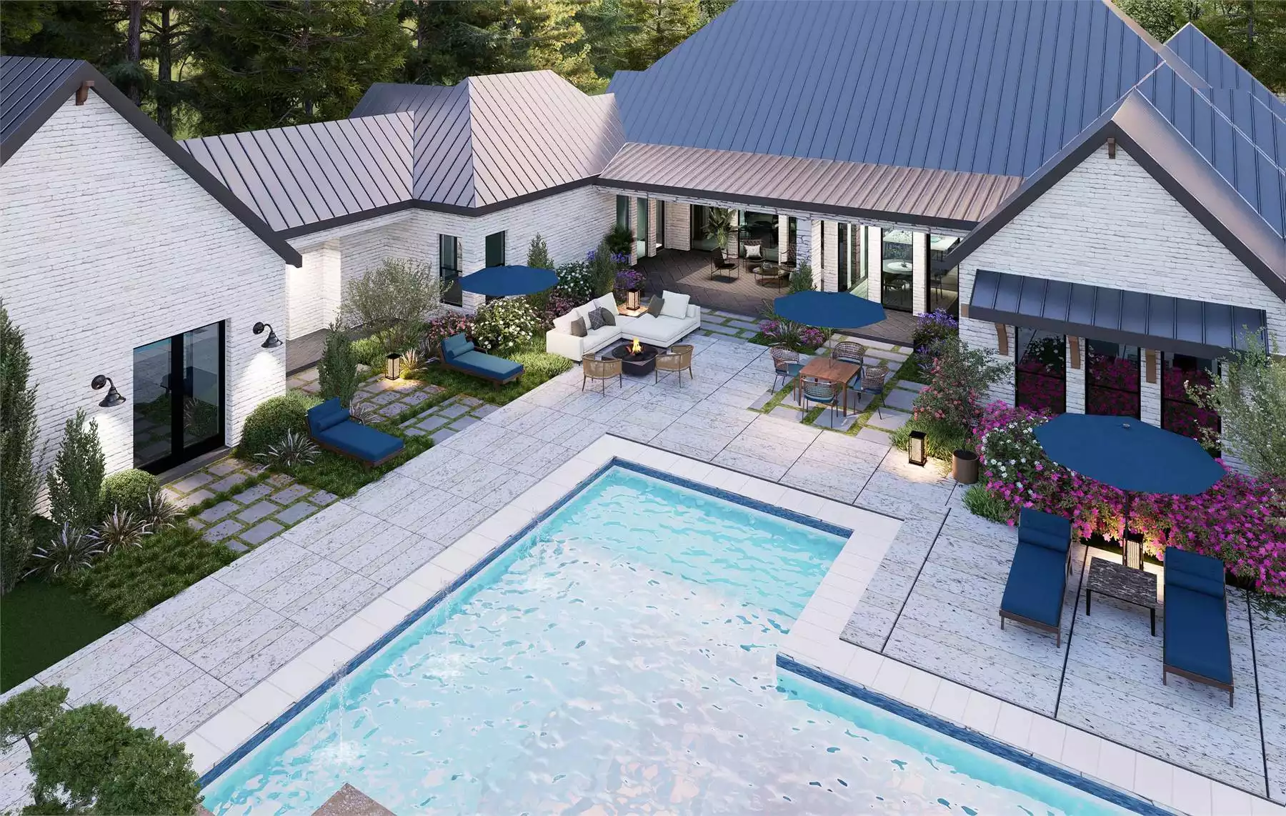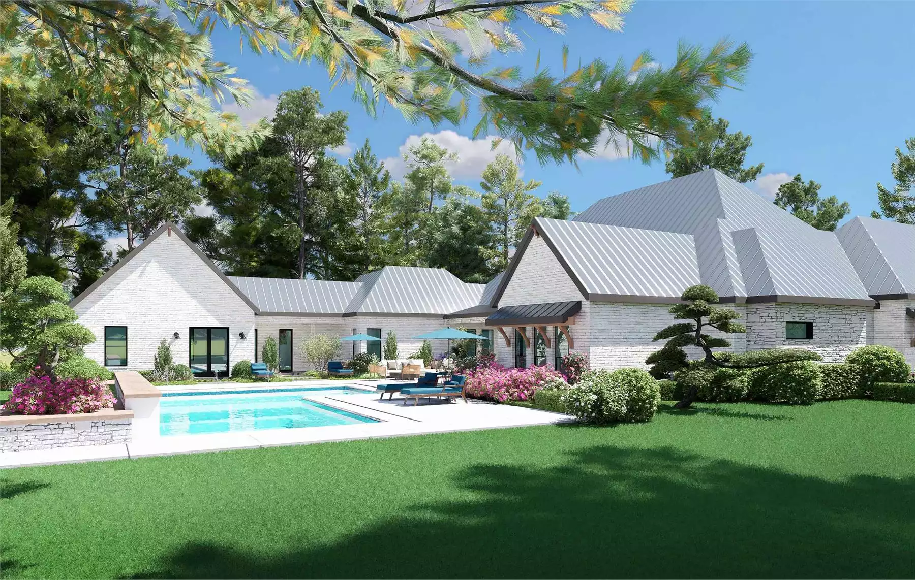 Still Gardens is a stunning 4,166 square foot modern farmhouse, thoughtfully designed with five bedrooms, 3.5 bathrooms, and a three-car garage to blend elegance with everyday comfort. A vaulted front porch welcomes guests into the home, leading to a formal dining room and guest suite at the front. The right wing features three additional bedrooms and two full bathrooms, with a flexible workshop/studio space, pool storage, and a powder room at the rear—perfect for creative or active lifestyles. On the left side, the three-car garage offers easy access to the utility room, making daily tasks seamless. Tucked away at the back, the owner’s suite provides a private sanctuary with a spa-like bathroom and spacious walk-in closet. The heart of the home is the central family room and kitchen, where a large island and open-concept design create an inviting space for gathering. Expanding the living experience, a generous outdoor lounge enhances indoor-outdoor connectivity. Upstairs, a vaulted loft, office, and storage space provide additional flexibility. Still Gardens is a modern farmhouse masterpiece, offering warmth, versatility, and sophisticated design for today’s lifestyle.