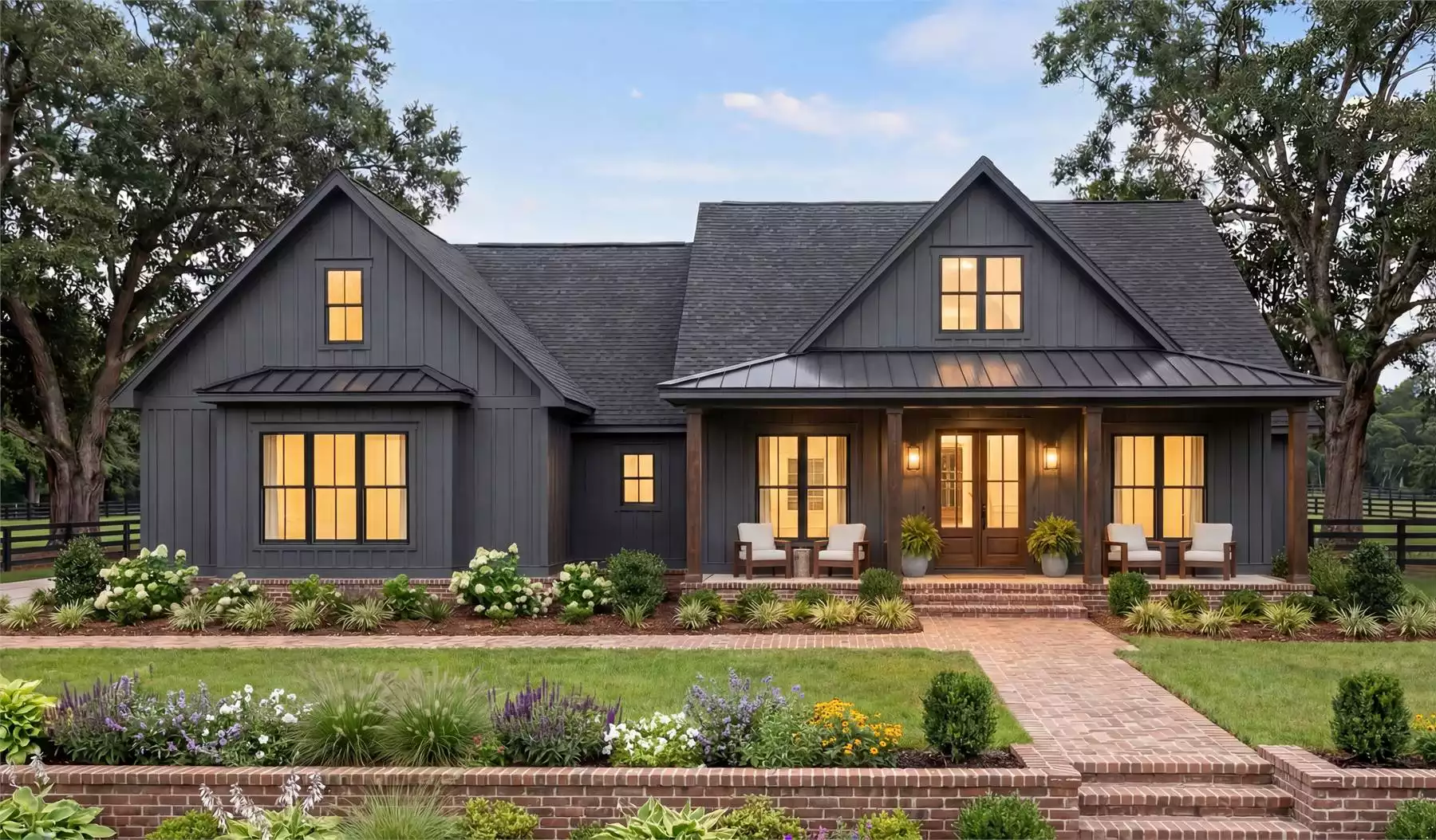 Beautiful Ranch Farmhouse View Interior & Exterior Customer Built New Home Tour! Client Custom Build of Popular 8516 Farmhouse Plan Client Custom Build of Popular 8516 Farmhouse Plan The New Trendy Black Modern Farmhouse Built in a Northwestern Suburb of Atlanta, Georgia A Welcoming Front Covered Entry Porch Client's Selected a Black Matte Exterior Paint Angled Front and Left View Rear View Showcasing Covered Patio Right Side View Side Angle of Columned Lined Entry Porch Rear Exterior with Stunning Pitched Roof The Perfect Retreat to Enjoy Summer Evenings Easy Entertaining with Access from the Great Room A Ceiling Paneled Back Patio Adds Outdoor Ambiance Open Front Entry Foyer with Adjoining Dining Room Bright and Open Great Room with Large Picture Windows The Large Great Room Features 15.5' Vaulted Ceiling An Open-Concept Floor Plan for Family Gatherings Great Room Fireplace & Hallway to Secondary Bedrooms Dining Room with Elegant Tray Ceiling An Open Dining Room with Easy Access to Kitchen Chef Inspired Gourmet Kitchen and Large Pantry Customer Selected Daltile Italian Inspired Backsplash Kitchen Farmhouse Sink with Rear Yard View Kitchen Island with Ample Seating for Serving & Entertaining Private Primary Bedroom Retreat with Vaulted Ceilings Primary Bedroom with Barn Door Access to Bath Primary Ensuite Bath With Soaking Tub & Walk-In Shower Primary Bed Vanity View into Oversized Walk-in Closet Primary Bedroom Extra Large Walk-In Closet Easy Access to Laundry Room from Primary Bedroom Hallway Shows Split Bedroom Design Offering Lots of Privacy Secondary Bedrooms are Spacious with Large Closets Secondary Bedroom View into Large Closet A Secondary Bedroom Nursery Secondary Bedroom with Hallway View Bath 2 with Custom Lockers A Great Idea for Extra Storage Space Bath 2 Showcasing Twin Vanities Powder Room Located Near Kitchen Laundry Room Conveniently Located Near Kitchen Large Laundry Room Offers Extra Storage Space Stairs Leading to Bonus Room Hallway and Stairs Leading to Bonus Room Rear View with Modified Skylights Allowing Natural Light Side/Garage View Featuring Large Dormer Living Room with Vaulted Ceilings and Modified Skylights Striking Dining Room Featuring Tray Ceiling Gorgeous Gourmet Kitchen Featuring Island Seating Kitchen Featuring Farmhouse Apron Sink Private Primary Retreat with Barn Doors to Ensuite Bath Beautiful Primary Bath with Soaking Tub and Walk-in Shower Beautiful Ranch Farmhouse Unmodified House Plan, Architect's Rendering Designer's Schematic Drawing of Front Exterior Designer's Schematic Drawing of Rear Exterior Designer's Schematic Drawing of Right Side Designer's Schematic Drawing of Left Side 1st Floor Plan Bonus Plan