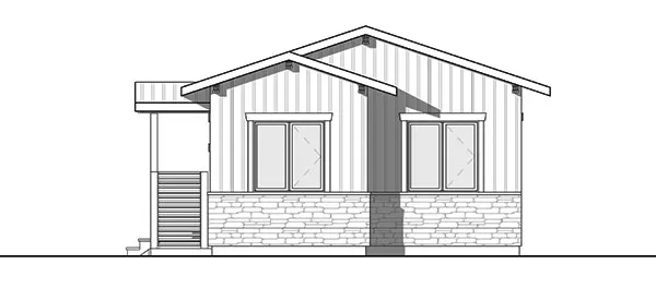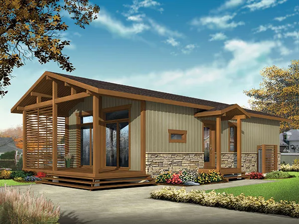 This rustic cottage plan includes two bedrooms. The efficient kitchen serves meals or snacks with ease. A small table will fit in the kitchen, while a larger table would be perfect for the dining room. The living room is the main gathering place, for good conversation and a few laughs. Note the pocket doors that keep the bedroom wing quiet and private.