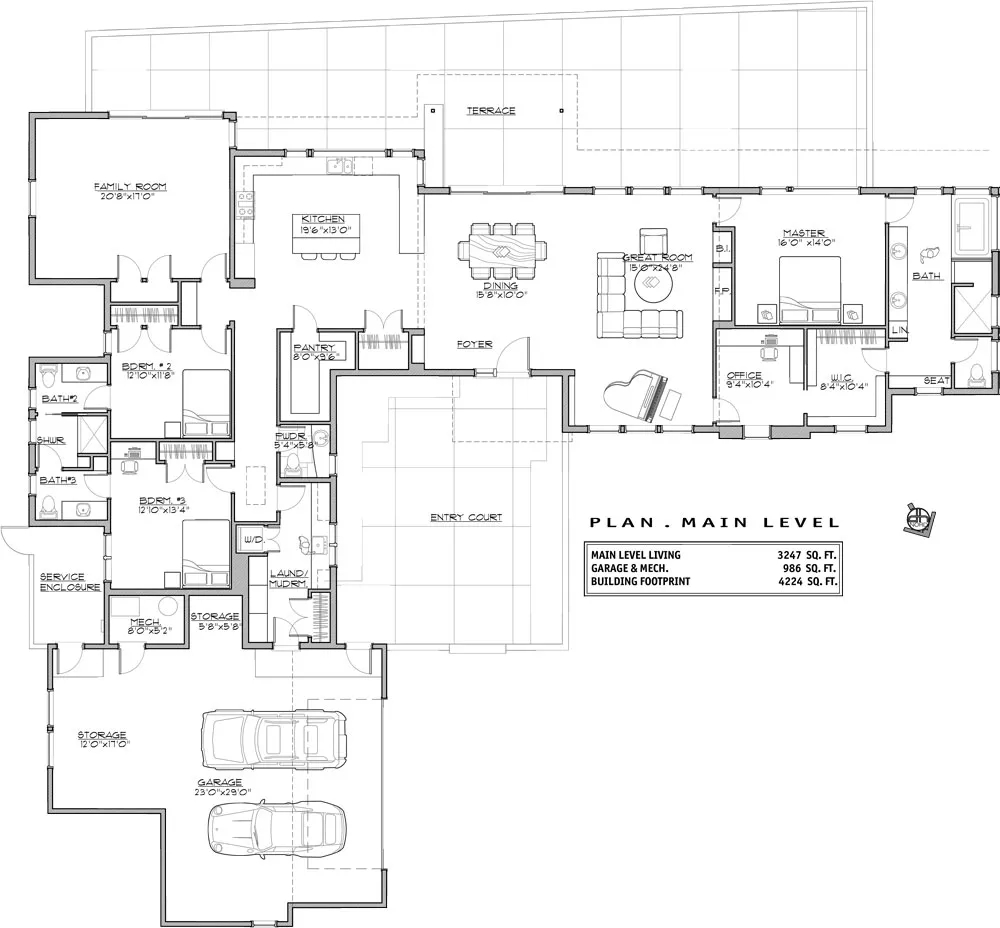 This contemporary three-bedroom design is sure to attract compliments from neighbors and passersby. Inside, the floor plan makes good use of its 3,247 square feet. The island kitchen flows into the dining area and great room, for easy entertaining. Note the crackling fireplace and the direct access to a rear terrace. A home office is perfectly situated to notice clients as they arrive. For casual relaxation, the family room is large and secluded. The luxurious master suite is anchored by a corner garden tub. Two secondary bedrooms share a split bath.