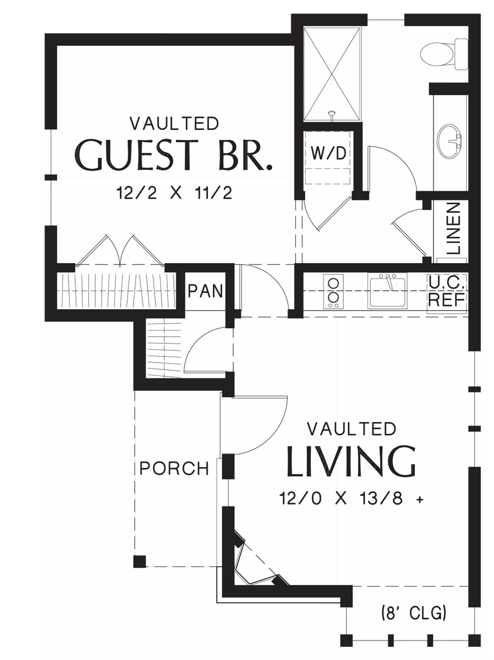This one-bedroom cottage design is cozy and charming! The stucco façade looks like something from a favorite fairy tale. You may be surprised to find that vaulted ceilings augment the interior spaces. A windowed bay and a crackling fireplace enhance the living room, while a kitchen area allows you to prepare meals and snacks. Note that the handy coat closet incorporates a pantry section. The bedroom, whether for guests or a getaway, is located near laundry facilities and a nice bath.