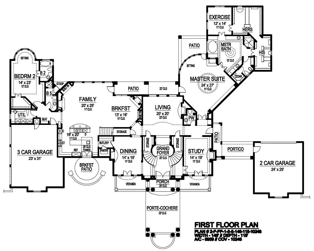 Whether you call this a castle or a luxury home, you will be delighted at its grandeur. Entering the porch between two verandas your eyes are drawn to the raised grand foyer with its double spiral staircase, winding its way to the second floor. The first floor has an inviting guest room with a sitting area, perfect for reading or enjoying the view out the back windows. The main living triangle, consisting of the kitchen, breakfast room and family room, receives added light through the 25' ceiling tower that leads to the breakfast patio out front. The study has a fireplace and access to a veranda and the grand foyer. The living room separates the main living area of this home from the master suite. When you finish in the study, relax in your private master suite with exercise room, private patio, sitting area, his and hers walk-in closets, cedar closet and elegant master bath. At the top of the spiral stairs, you will find two bedrooms with a Jack and Jill bath, plus a fifth bedroom with bath access. You will enjoy entertaining in the bonus and game rooms.