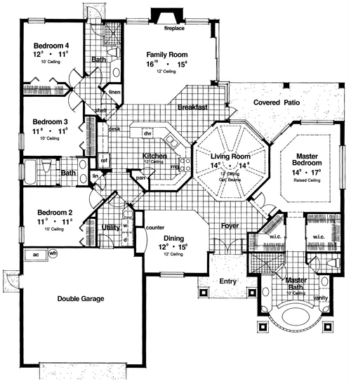 Driving up to this home in the evening is a breathtaking experience, with the full beauty of the bowed glass block wall of the master bath glistening like diamonds. The understated elegance, which is timeless, welcomes you into the foyer, which explodes with many vista's in all directions. The octagonal formal living room, with its mitered glass wall, allows spectacular views of the outdoor living space. To the left of the foyer is the formal dining room with its furniture niche. To the right, double doors lead into the master suite, which can be enlarged to create a sitting area off the covered patio. The lavish master bath's focal point is the magnificent setting for the soaking tub. Imagine a gently curving wall of glass block for the tub's background, pouring natural light into the space. Matching his and hers vanities, with niches, grace each side of the tub, their mirrored walls reflecting the glass block! The generous shower and private toilet chamber complete the wet area and matching his and hers closets are the icing on the cake. The family side of this home will meet any family's needs with shared, yet private, bath facilities, big closets and a pool bath. The kitchen/family and nook area combine to make this plan complete.