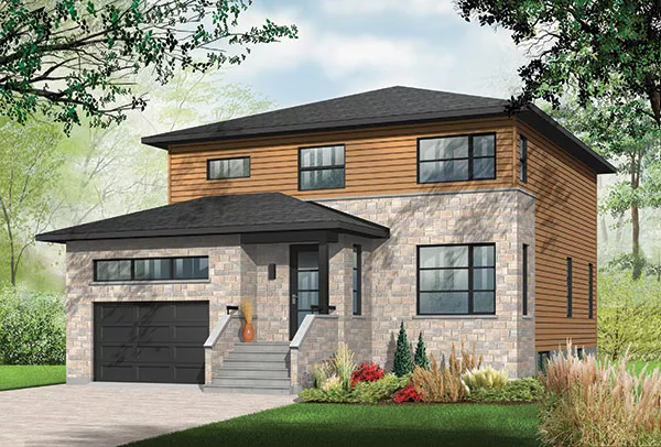 Abundant windows and striking stone give great curb appeal to this modern two-story house plan, with four bedrooms, 2.5 baths and 2,135 square feet of living area. Converse with friends in the comfortable great room of this home plan, warmed by a two-sided fireplace. The versatile dining room hosts any meal in style. The island kitchen lies near a full-sized laundry room. Step into the backyard for a breath of fresh air and a refreshing beverage. Upstairs, you'll appreciate the deluxe master bedroom and the unique walk-through closet. A garden tub anchors the personal bath, along with a sizable shower and dual sinks. A hall bath with two sinks lies close to three children's bedrooms. Our customers love the air-lock feature at the front entry of this home design, keeping winter winds out.