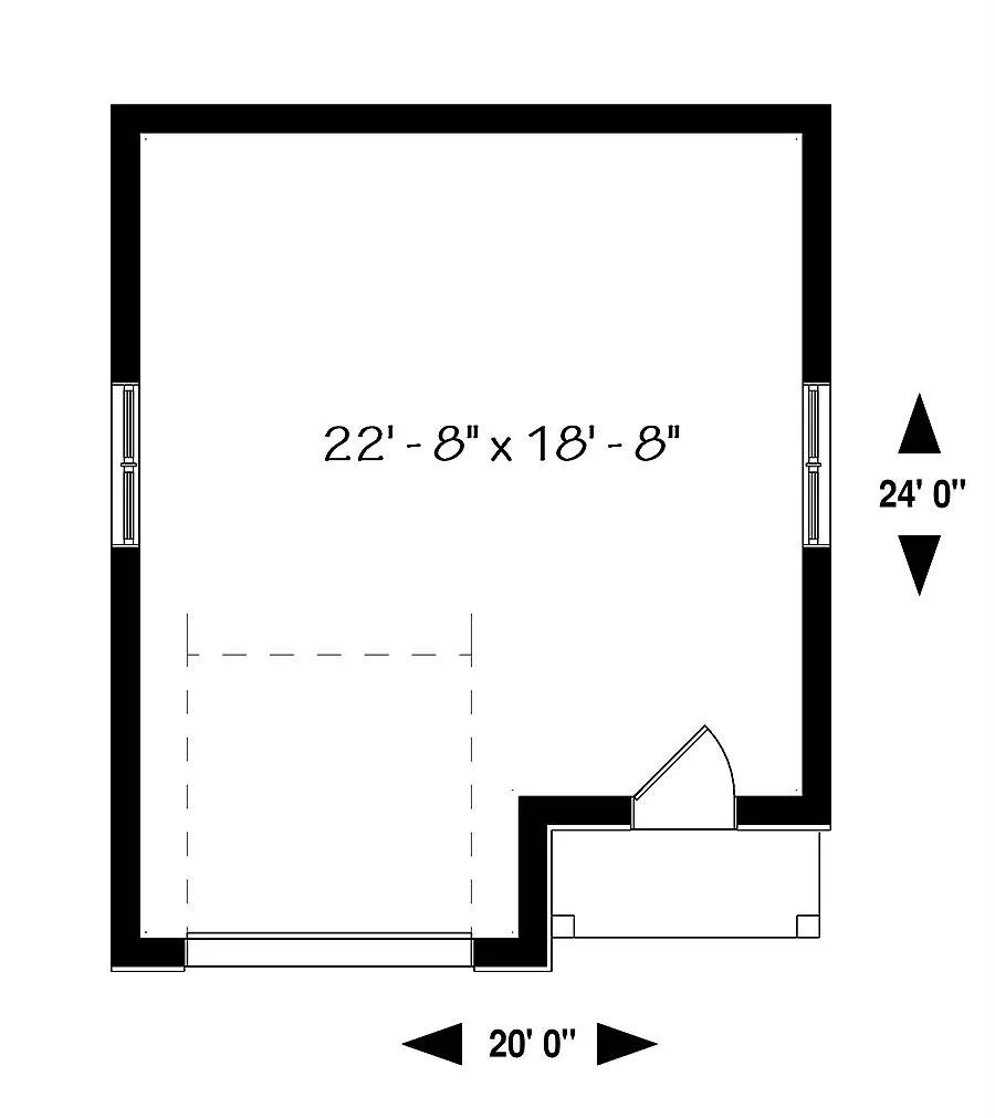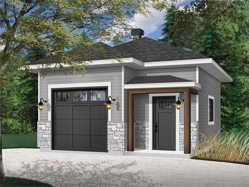 One-car garage plan with 448 square foot, modern style, 10' ceiling, storage area or workshop space, with a covered porch.