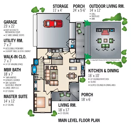 This Victorian farmhouse is designed for those that want authentic styling and a lot of outdoor living space but in a small home. The outdoor living space has a fireplace, grill, sink and cabinets to provide that perfect spot for outdoor entertainment. Operable shutters located on the front of the outdoor living room provide privacy from the street. The mechanical equipment is located in the garage so that it can be easily serviced from the outside. The master suite is large enough for king size furniture. The adjoining bath has a separate shower, spa and a large linen under the stairwell. The utility room has a floor to ceiling storage cabinet and a nice folding table for laundry. Two ample sized bedrooms are located over the garage on the upper level. This is a super energy saving design featuring 2x6 exterior walls.