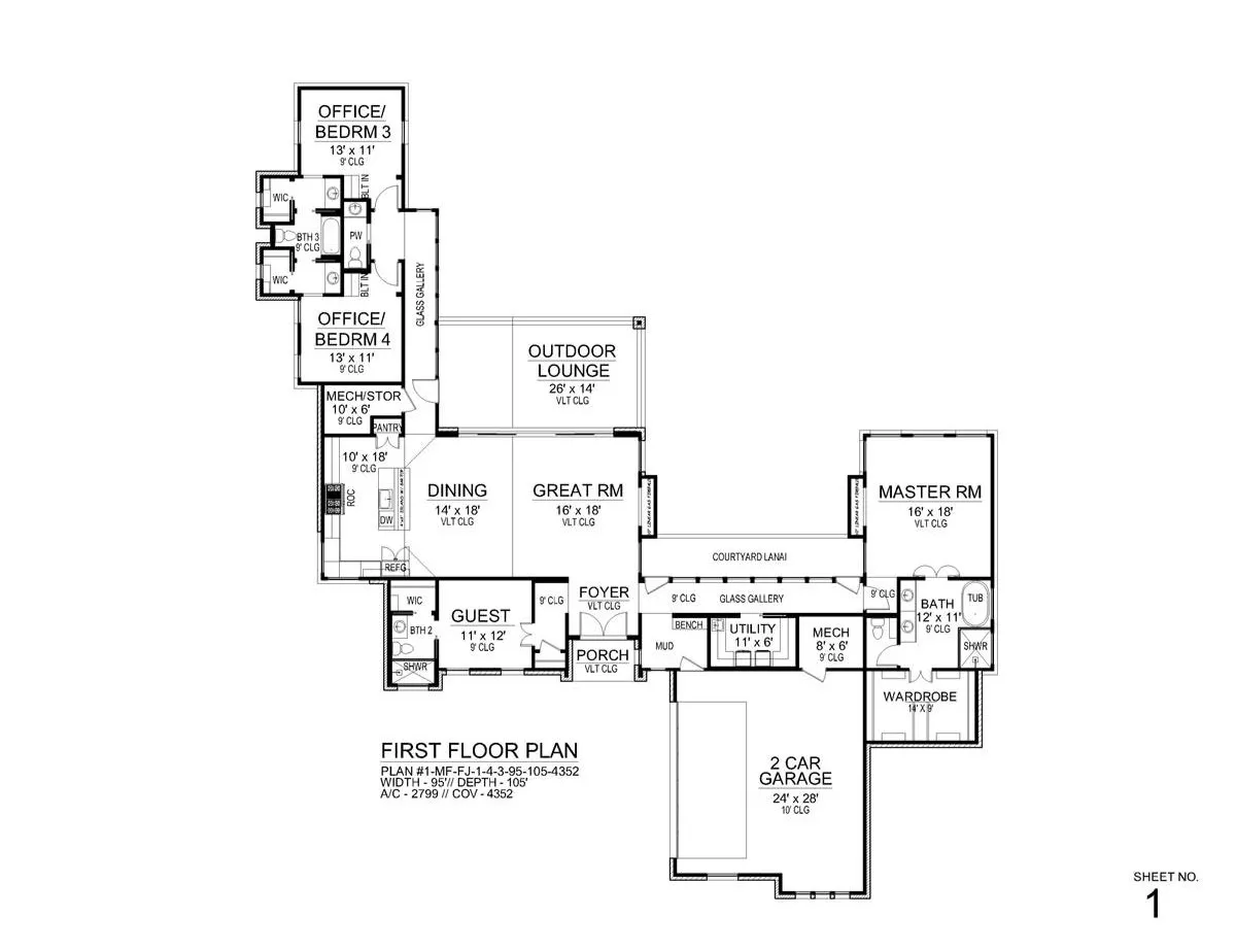 This 2,799 sq.ft. sprawling 1 story modern home brings the inside out with its 2 window-lined gallery hallways and the huge wall of sliding glass doors in the open concept great room that melds the dining room and 3 point kitchen providing airiness to the social spaces. The linear gas fireplace on the wall anchors the large space along with the eat-at island in the kitchen. The huge covered outdoor lounge will most certainly host many evenings for the family and might become the favored neighborhood spot for nightcaps with the adults.