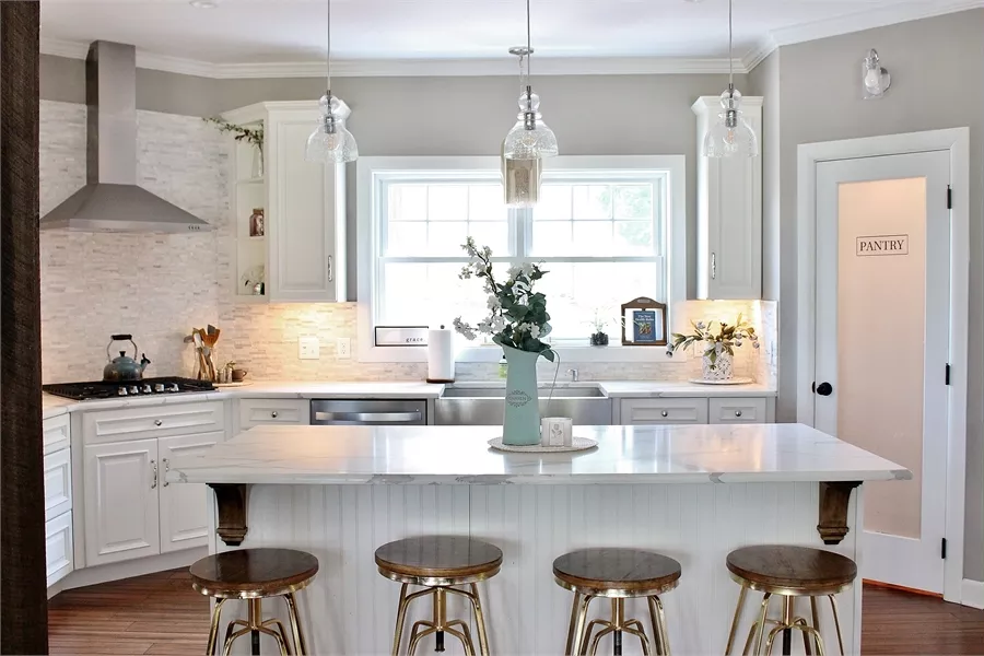 Main house features large kitchen with direct access to immense multi-use space for laundry, pantry, and mudroom.