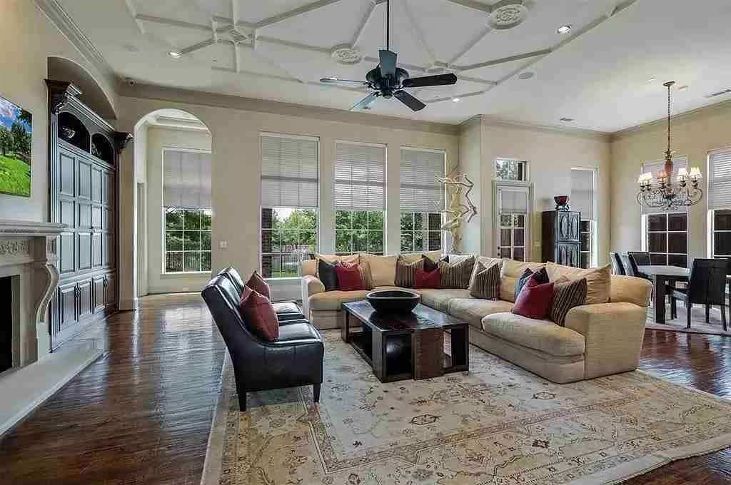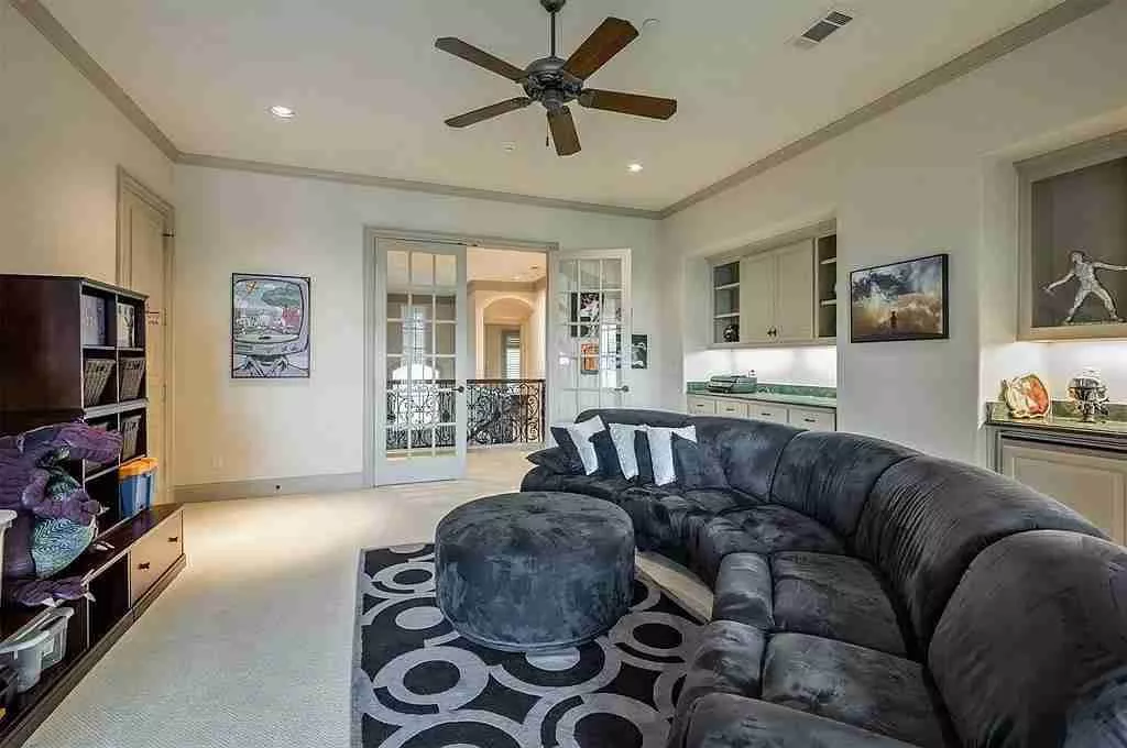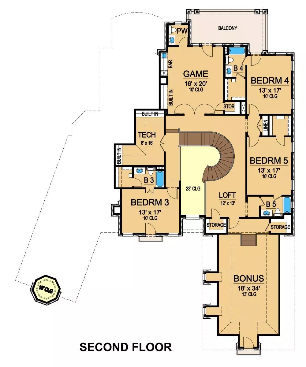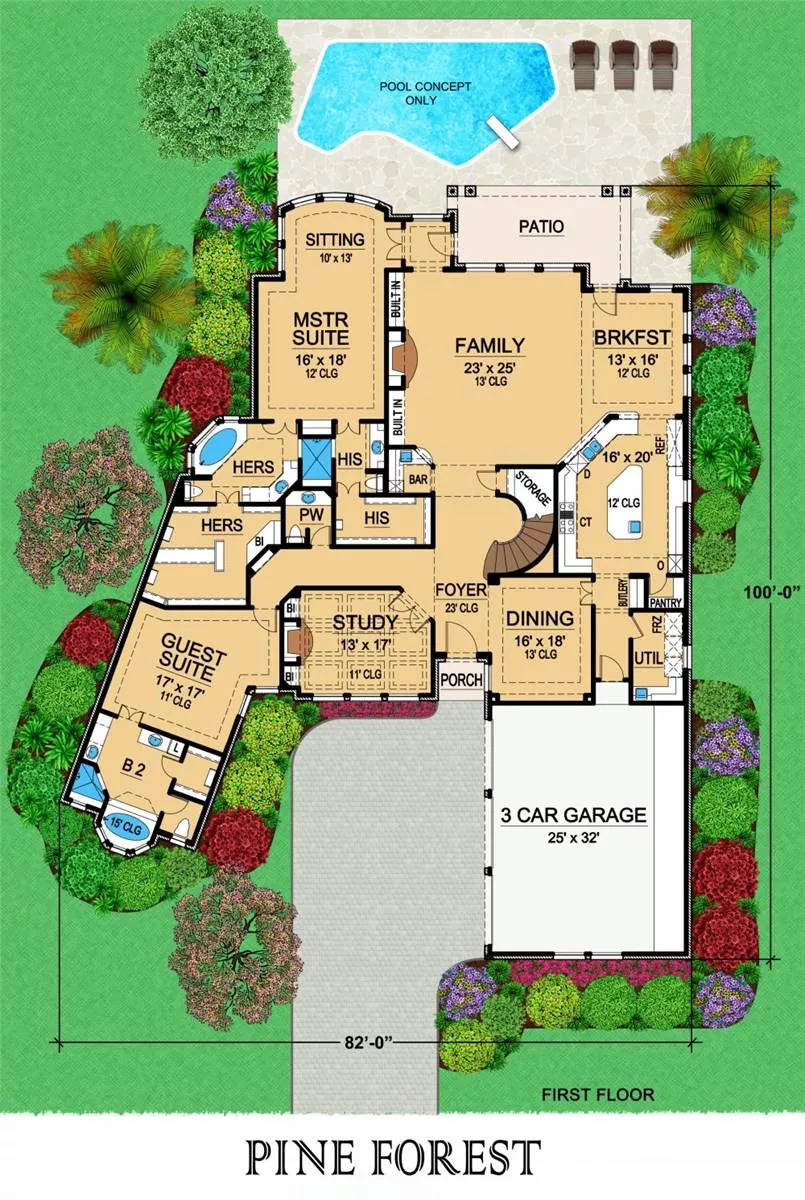 The (concept) pool meets you as you enter this luxury house plan. The right wing includes a study with bayed window and built-ins, a full bath, media room, gallery, living room with warming fireplace, elegant dining room with large decorative pillars that define its perimeters, direct access to the pantry and kitchen for ease in serving and the family room, kitchen, breakfast area. The kitchen has a free-standing center island for extra counter space. The family room offers built-ins and a warming fireplace to warm the kitchen, dining room, and breakfast area. The master suite offers a sitting area, trey ceiling, lavish master bath with his and hers vanities, separate shower, corner whirlpool tub, built-ins in the wardrobe, storage, utility room and powder room. Access to the patio from the master suite and master bath allows for spectacular views of the yard.