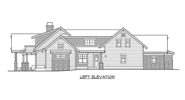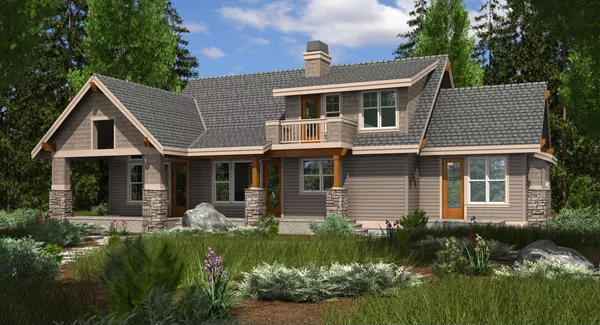 Craftsman details enhance the exterior of this four-bedroom house plan. The interior of the home plan is nicely arranged for entertaining.  Imagine throwing a dinner party in the vaulted dining area and great room, and then expanding to the rear porch for dessert and coffee. The fantastic kitchen includes a good-sized pantry. At day's end, soak in the garden tub before retiring to the vaulted master bedroom. Don't overlook the den or home office, which serves as a bedroom suite if needed. A bonus suite on the upper floor would be perfect for a returning child.