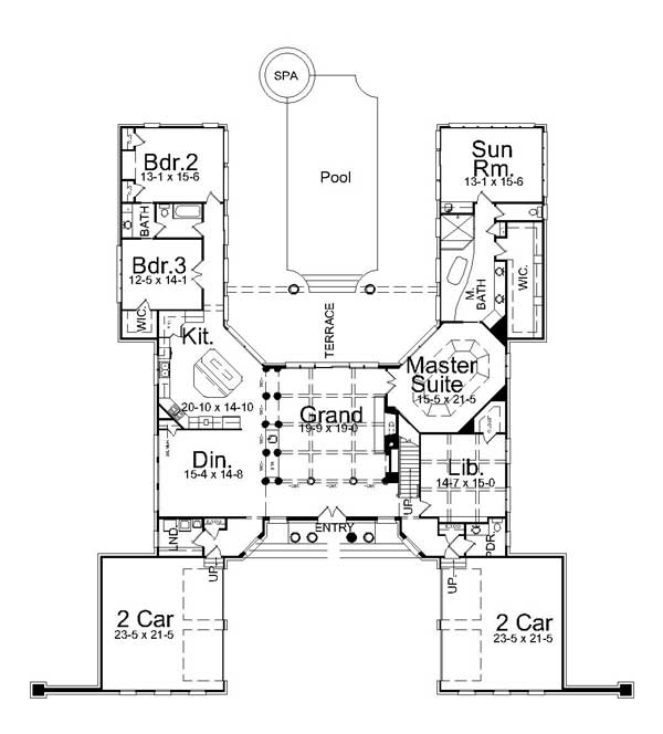 The columned defined entry to this luxury house plan opens to a large, coffered ceiling, Grand Room. The Grand Room is open to the surrounding Rooms and has an enjoyable view of the rear Terrace. The elegant Dining Room is located next to the gourmet Kitchen for easy hosting. Two family rooms are located at the rear of this Estate house plan. The Master Suite is located across the home featuring a luxurious Bath, huge walk-in closets, and a Sun room with a magnificent view of the outdoor scenery.