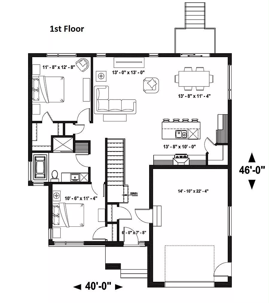 Modern 1,238 square foot one floor home plan with garage.   Outside, on the main façade, a mix of stone and wood provide an attractive and timeless look, while inside a welcoming entrance leads onto an activity area completely open (kitchen, dining and living room open concept) and overlooking the backyard. This also offers plenty of amenities like the main entrance with coat closet and access to the garage, this remarkable kitchen with pantry, excellent storage and central island-lunch area. Also not to be missed is the spacious living and dining area with plenty of windows, two good sized bedrooms and a bathroom with independent shower stall that is much appreciated by the new owners.