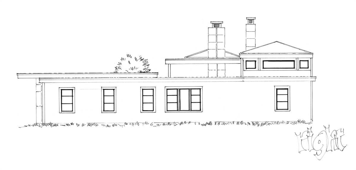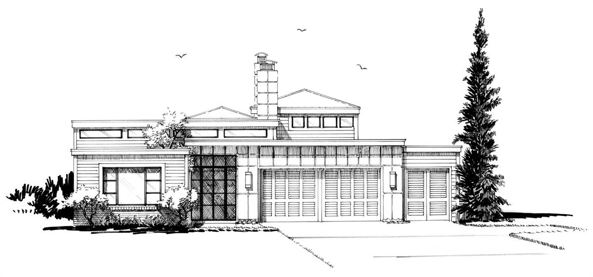 This highly desirable contemporary ranch house plan is the perfect home for entertaining with its open floor plan and high ceilings connecting the living room, kitchen, and dining room. The courtyard at the front entrance makes a statement and highlights the architectural and landscaping details of the home. Ease into the outdoor living space with large sliding pocket doors that open onto the covered patio. With just over 2,000 square feet, this unique midsize design includes 3 bedrooms, 3.5 baths, and a three-car garage to keep the whole family happy. You'll find plenty of storage throughout the one-level floor plan, including ample bedroom closets, a mudroom, a laundry room, and a garage workshop area. Make sure to study the layout, because it's not like other homes you've seen with the private bedroom suite! This home was inspired by House Plan 1954