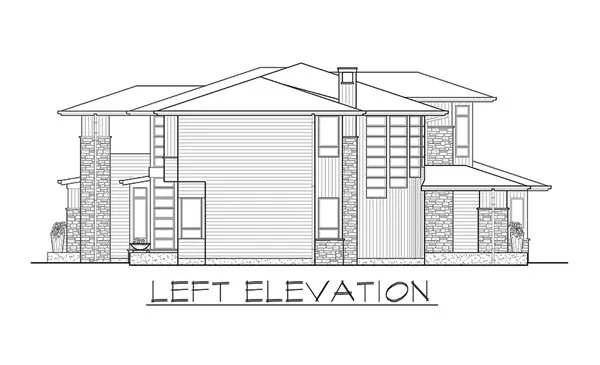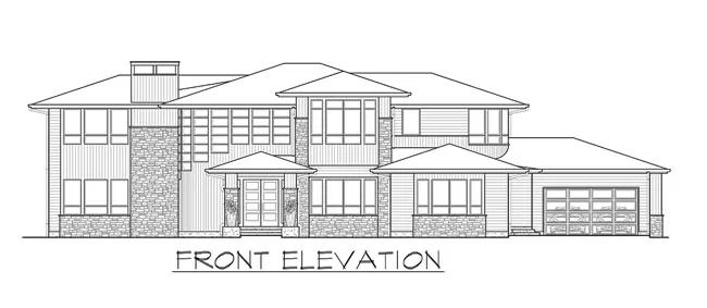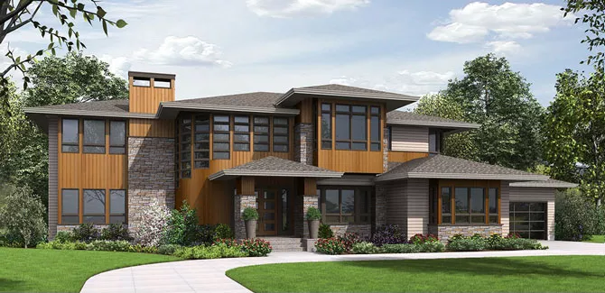 Numerous windows and stone accents give this modern two-story house plan much appeal. If you're looking for a home plan that will be the talk of the neighborhood, look no further. The main entry opens to the foyer, with the formal dining room in view. A high ceiling presides over the central great room, where a crackling fireplace enhances any gathering. The island kitchen is open and inviting. The bright nook is perfect for casual meals. When weather permits, make good use of the outdoor living space. Across the home, a quiet den would make a nice home office. Guests will appreciate their personal suite with patio access. Upstairs, the opulent master suite flaunts its own covered deck. A secluded bonus room can be anything you wish.