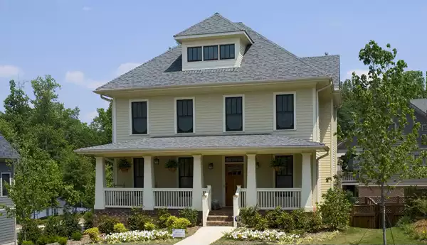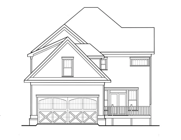 This 2,768-square-foot design is one of many house plans with a narrow width, perfect for a city lot. Tapered columns give the railed front porch a welcoming look. Inside, the living room hosts any event in style, with its fireplace, shelves and French doors to a breezy deck. The highlight of the floor plans may be the kitchen, with its curved island and handy pantry. If you like home plans with all of the bedrooms upstairs, keeping the mess and clutter out of the view of unannounced visitors, youre in luck!