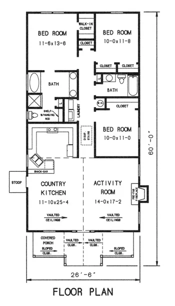 The perfect cottage for retirement or a starter home. The center section is vaulted with an arched entry providing extra sunlight in the central living areas. The kitchen includes a wrap around cabinet area and snack bar. Three bedrooms are grouped to the rear forming a quiet zone.