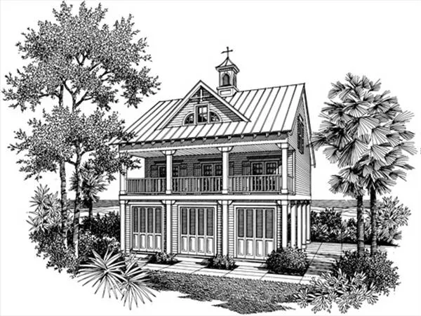 Designed as an affordable beach cottage, this two bedroom doll house has a full length front porch to enjoy sunsets and beach scenery. The ground level can be used as an open carport. It also houses an enclosed stairwell entry to the main level, a utility room and storage area for lockout storage.
