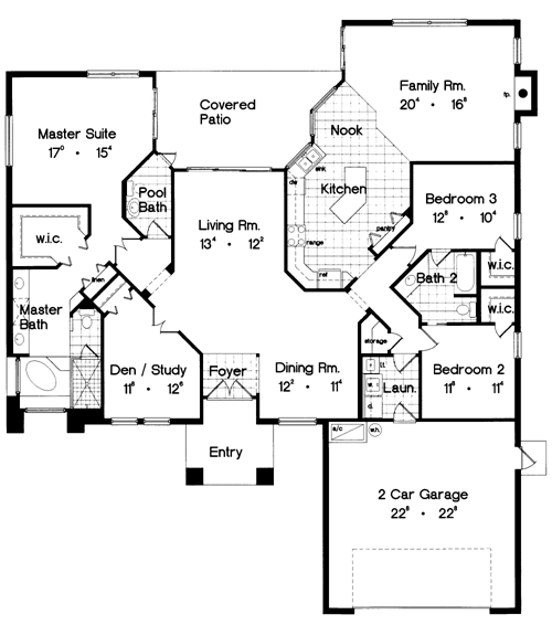 Traditional key stone trim and archtop windows bring stately charm to a plan that creates long vistas once inside. The foyer opened onto the formal spaces of the living and dining rooms. Lots of glass make these spaces open and airy double doors lead to the den/study, while just off a small hall the powder/pool bath is tucked away. Another pair of double doors welcomes you into the master suite which has a foyer separating the sleeping area from the bath. Corners of glass and doors allow for glimpses of the patio and pool area. The bath makes an efficient use of space with an oversized walk in, double vanities soaking tub and private shower/toilet chamber. Note the convenience of a linen closet too! While two secondary bedrooms share walk-in closets and a private toilet, the family living space is equally impressive. The island kitchen overlooks the breakfast nook and family room which has a fireplace/media wall as its centerpiece. Completing the design is a generous hall closet off the utility room, which accesses the two car garage.