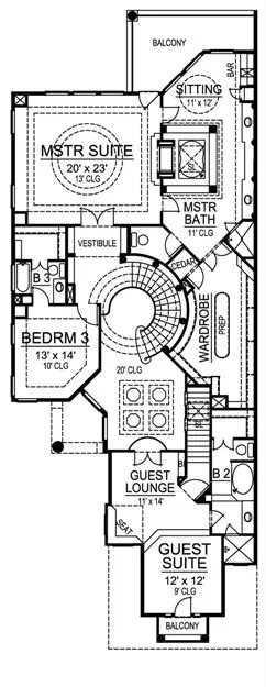 This Tuscan luxury home is perfect for a narrow lot. The spacious raised two-story foyer offers a curved staircase and is open into the living room. A quiet study shares a two-way fireplace with the elegant dining room. The butlery, pantry and kitchen are off the dining room, and offer ease in serving. The kitchen includes a free-standing island and breakfast bar for use by the breakfast area and family room. The family room has built-ins and a warming fireplace to keep the entire family gathering area cozy. The breakfast area incorporates built-ins, a bar and views of the garden from the patio. A three car garage with storage completes the first floor. Upstairs, a secondary bedroom with tray ceiling, walk-in closet and full bath shares space with a guest suite with sitting area, private balcony, and full bath. The luxurious master suite is also on the upper level, boasting a tray ceiling, sitting area, two way fireplace shared between the master suite and master bath, his and hers vanities, separate shower, tub, and a large wardrobe.