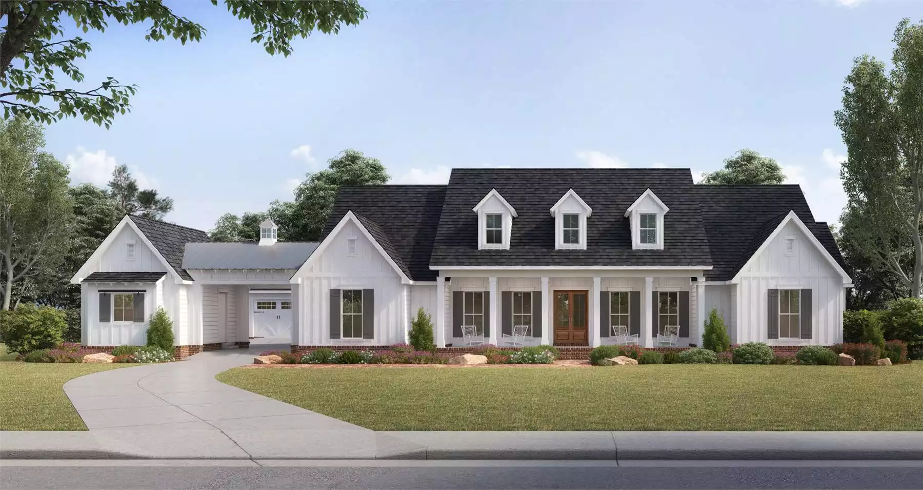 Take everything that you know and love about farmhouse-style plans and put it together and the result is this stunning home. An exceedingly comfortable 3,272 square feet of living space is enhanced by an accessible ranch-style layout, meaning that everything flows naturally together. The drive up to this home is one of the most impressive things, as you drive under an entryway and into your very own motor court, complete with 3 garages and a private workshop space! The amazement continues as you move inside to discover 4 bedrooms and 3.1 bathrooms, including the master suite, complete with his and hers walk-in closets and a spa bath that you'll have to see to believe. Other highlights of this home include the gourmet eat-in kitchen, a welcoming family room, and even a game room, perfect for the kids. We also think that you'll love the astonishing outdoor entertainment space, including its very own kitchen and bar!
