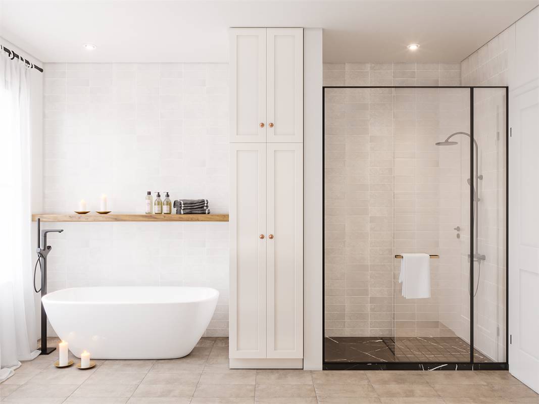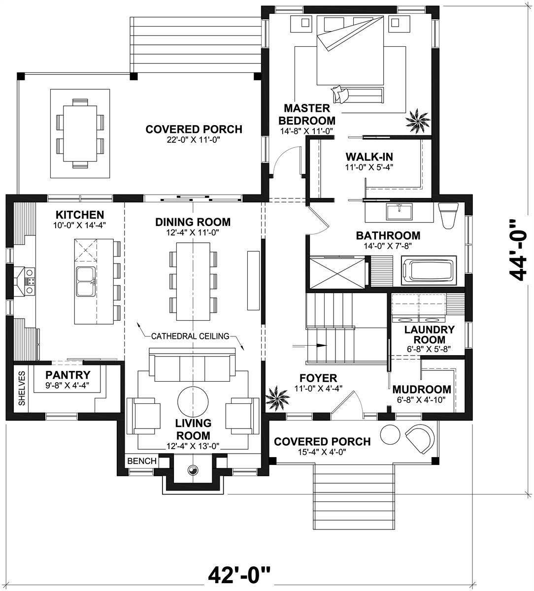 This sleek 1 story plan (with additional lower level of 1,200 sq.ft) packs a bunch with its modest 2,400 sq.ft. Entering the charmer you’ll immediately have access to the mudroom for coats and boots with the laundry room conveniently adjacent with a pocket door. If you continue through the gallery hallway, you’ll find the Master suite claims the back right of the main level with its bathroom being accessible from the hallway as well as the master walk-in closet (via a pocket door).