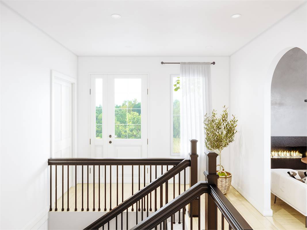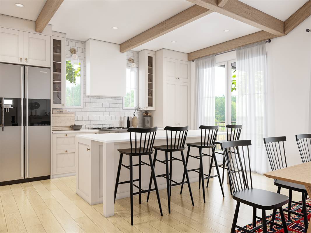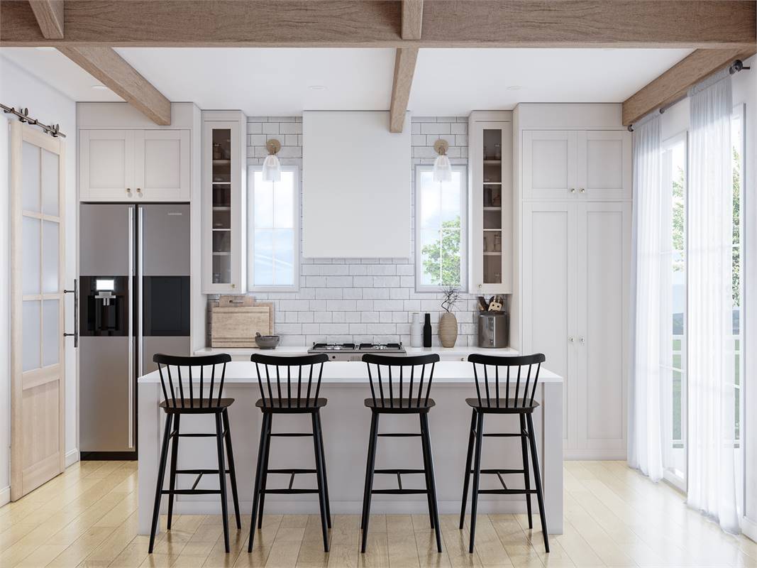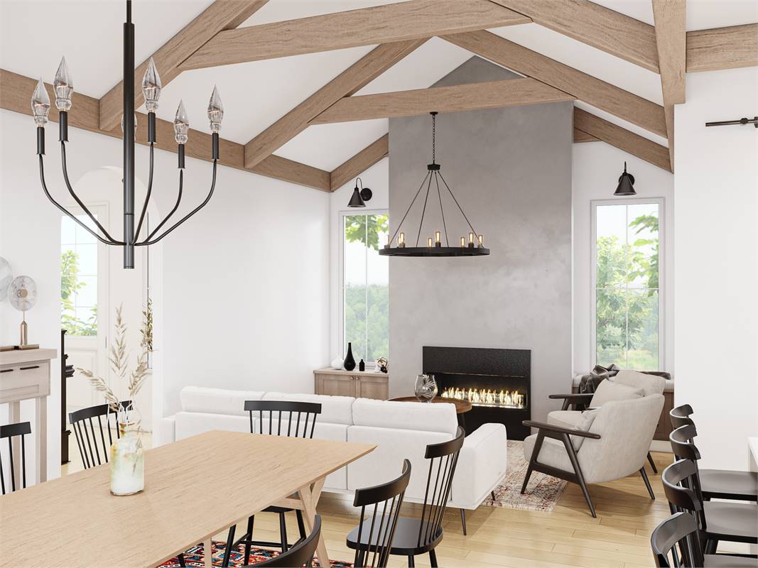 The open concept plan has a cathedral ceiling with exposed open gables enunciating the “farm” in the house. The living room is anchored by a fireplace and the cook of the home will love the large pantry accessed by a sliding barn door. The covered porch has sliding glass doors and brings additional social spaces in mild weather months.