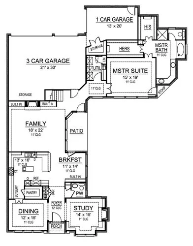 This stunning luxury house plan is perfect for a zero lot line. The foyer is flanked by the cozy study with trey ceiling and warming fireplace on one side, and on the other side, the elegant dining room with trey ceiling and direct access to the butlery, pantry, and kitchen for ease in serving. The kitchen provides a free-standing breakfast bar for ease in serving the family room or breakfast area. The fireplace, flanked with built-ins, provides warmth throughout the gathering area. A wall of windows faces the patio to enjoy the landscaped yard. A utility room is located outside the master suite. The master suite boasts a trey ceiling, lavish master bath with his and hers vanities, his and hers wardrobes, separate shower and tub. Two garages, a one-car and a three-car, both with storage areas, are situated in the rear of this luxury house plan. The second level offers two family bedrooms with walk-in closets and full baths that share space with a loft boasting a built-in desk and bookcase. Take a look at this luxury house plan.